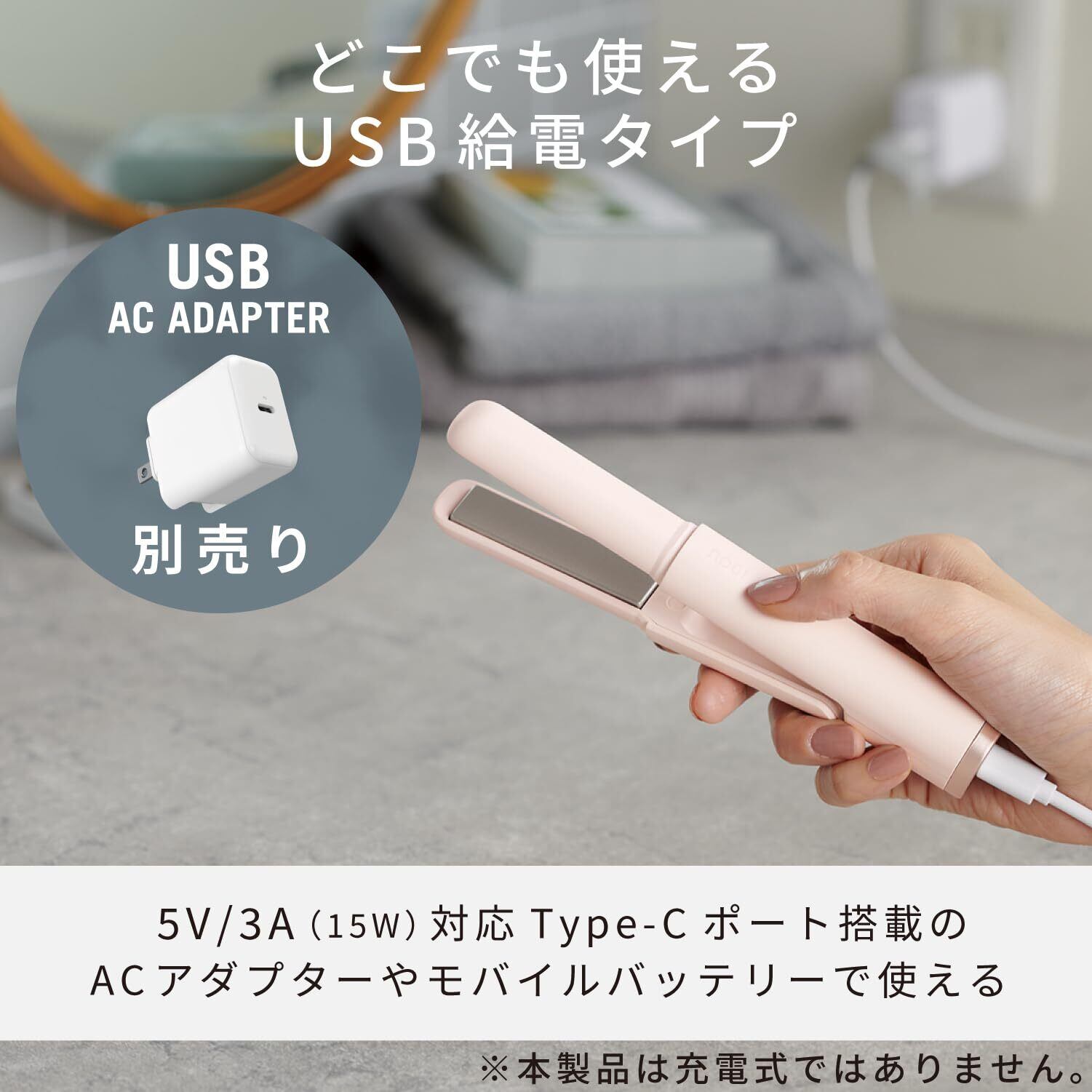 給電用のケーブル付きで、5V/3A(15W)対応のACアダプターやモバイルバッテリーなどに挿してすぐに使用でき、場所を選びません。※複数ポート搭載のACアダプターやモバイルバッテリーなどをご使用になる場合は、USBヘアアイロン単独でのご使用を推奨します。推奨USB Type-C(TM)対応 ACアダプター(型番:HAB-HIA01CWH)は別売りです。