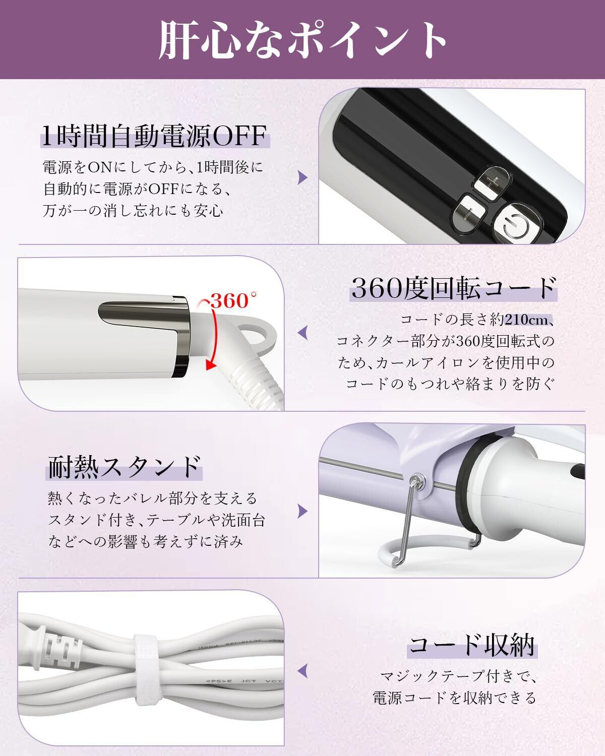 【髪を守る設計で安心の使用感!】セラミックコーティングにより、髪のダメージを最小限に抑えつつ、滑らかでしっとりとした仕上がりを実現します。艶のあるカールを一日中保つことができるので、毎日のスタイリングが楽になります。