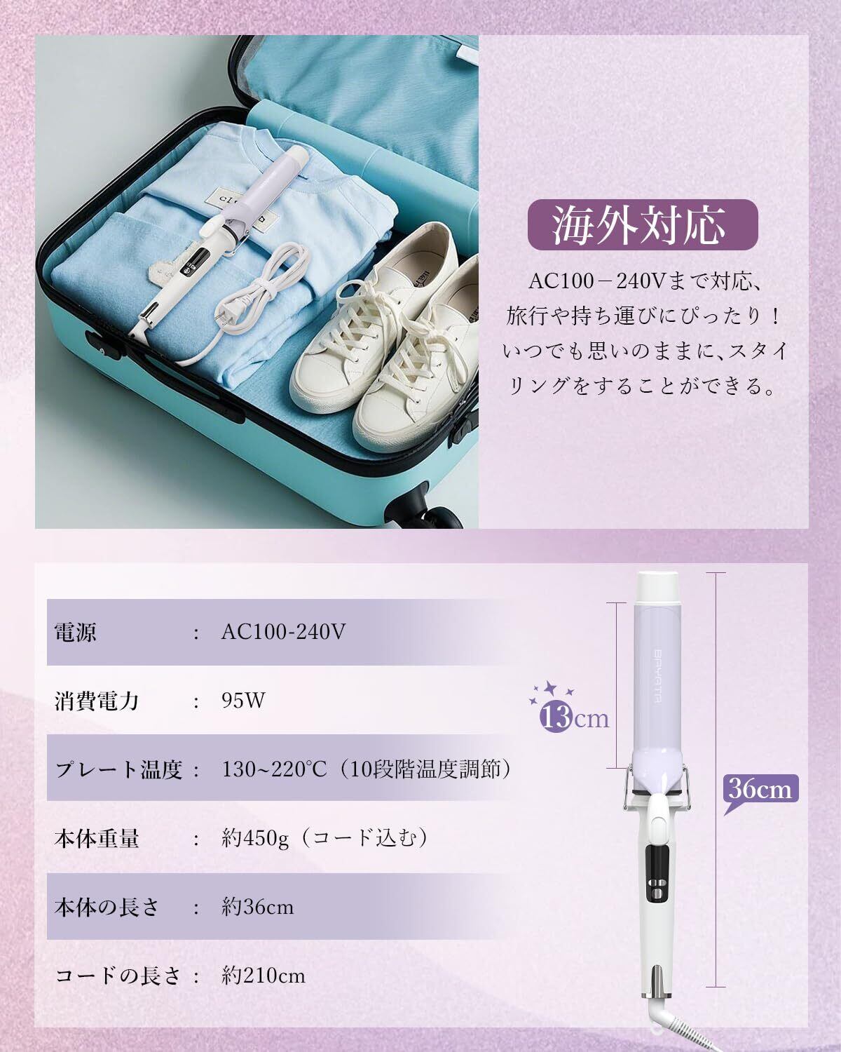 【海外対応&360度回転式&長めコード】38mmコテが100V~240Vまで対応しているので、海外でも使用できます。(※変換プラグはご用意ください。)360度回転式で使用中のコードのもつれや絡まりを防ぎます。さらに、約210cm長めの電源コード、場所を問わずにお使いいただけます。マジックテープ付きで、電源コードも収納できます。旅行や持ち運びにぴったり!いつでも思いのままに、スタイリングをすることができます。