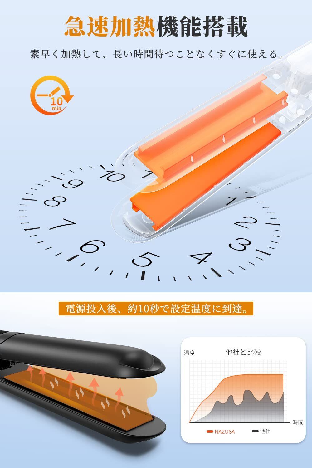 【火傷防止と安全ロック設計】ストレートヘアーの先端は火傷防止設計を採用し、使用時に先端を握る防火板で完璧なスタイリングができ、使用しないときに火傷をつけません。 危険性を最小限に抑え、より安全に使用できます。 また、ヘアアイロンの裏側に安全ロックが付いており、一時停止や使用しない時はロックを開ければ、火傷を防ぎ、クリップボードの役割を果たし、また外出の旅行時にも便利に収納できます。