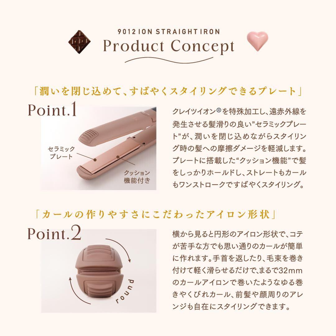 Point3.潤いを閉じ込めて、ツヤっととろける質感の仕上がりに プレートにクレイツイオン︎を加工。クレイツイオン︎の効果で髪に潤い感を与えながらキューティクルを整えることで、とろけるショコラのような、なめらかでツヤのある質感のストレートやカールスタイルに。