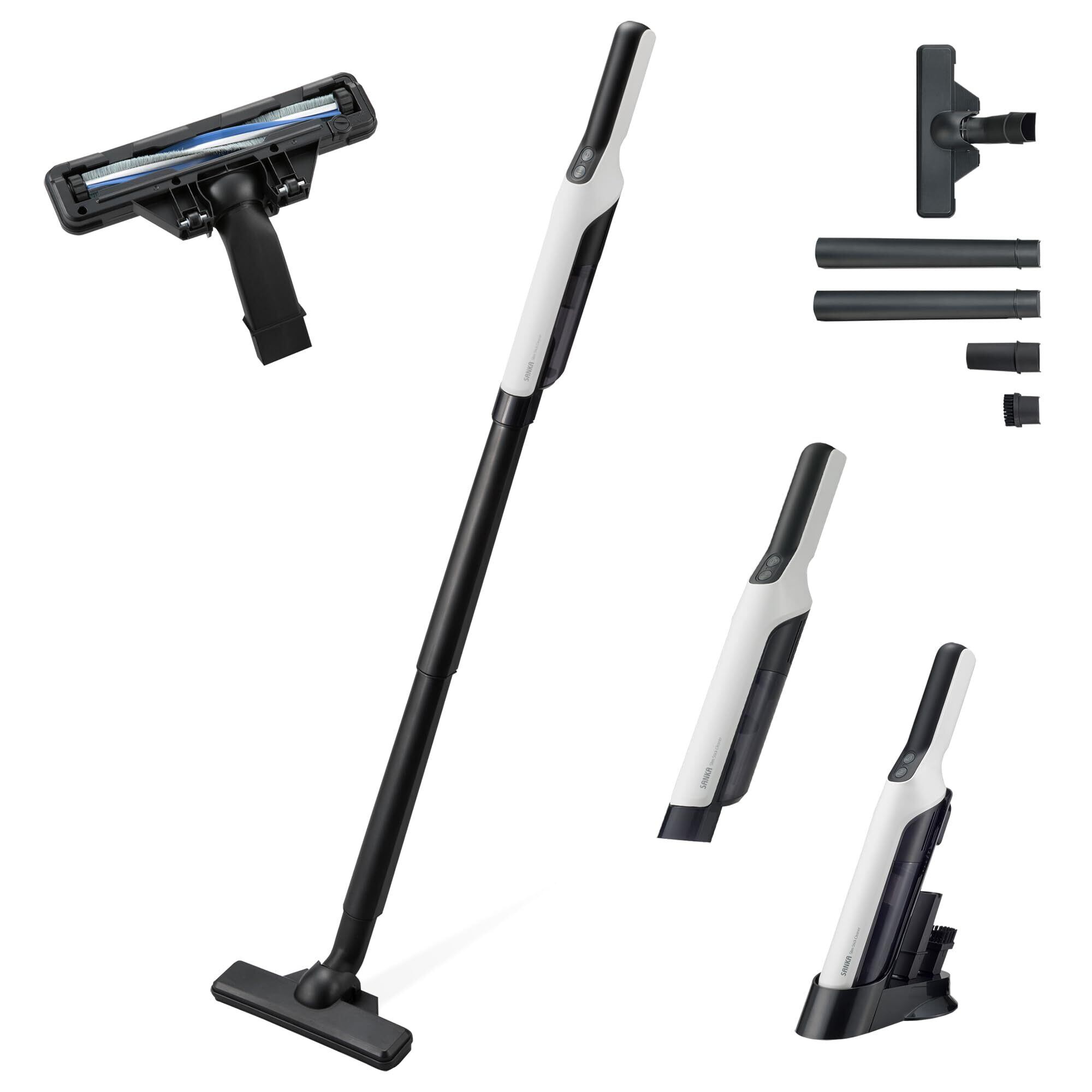 いつでも手の届くところに置けるSlim Styleお掃除するのが楽しくなる超軽量0.9kgDCブラシレスモーター搭載で驚きの吸い込みパワー●製品仕様充電池:Li-ion DC10.8V 2000mA定格(ACアダプター入力):AC100-240V 50-60Hz定格(ACアダプター出力):DC15V 500mA連続運転時間:22分(弱)/10分(強)充電時間:4時間最大真空度:13.0kPa(キロパスカル)最大集塵容量:0.24L騒音レベル:80dB以下集塵方式:ダイレクト集塵 ※延長パイプをつけた状態(スティッククリーナーの状態)で立てておけるスタンドは付属していません。