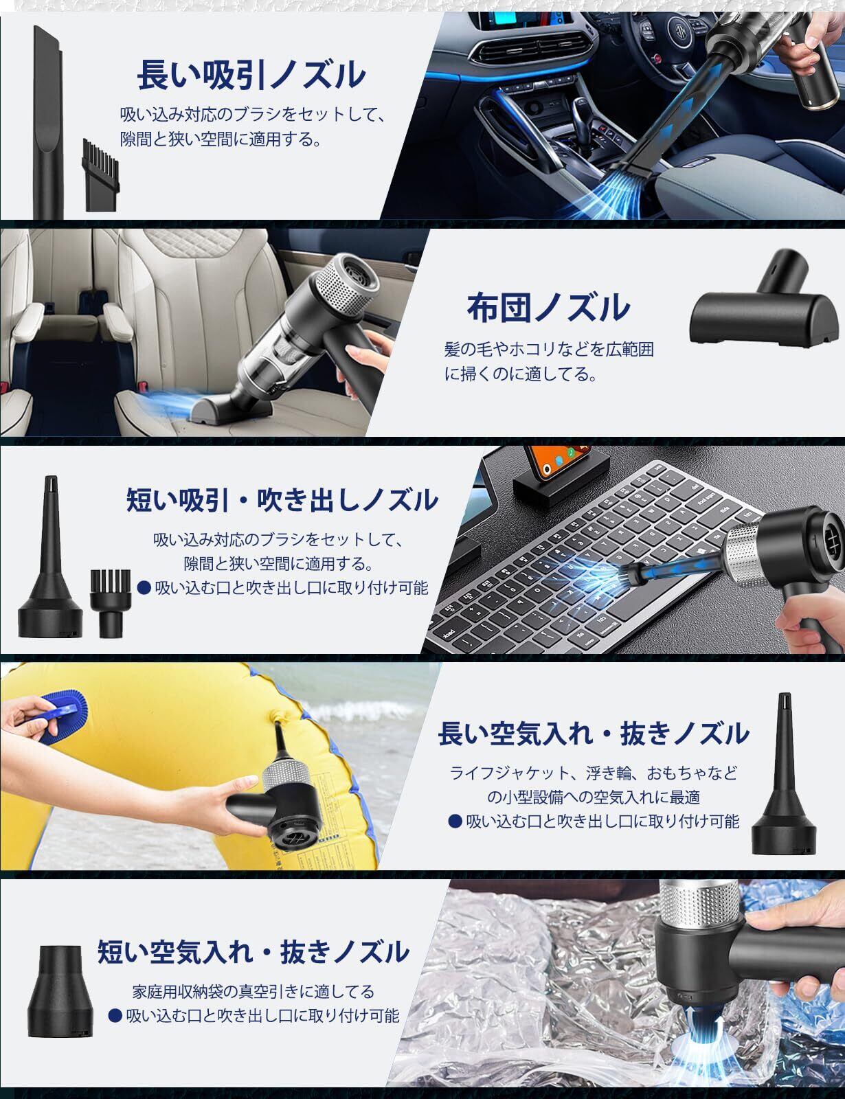 【多機能付き、操作簡単】全部で7つの交換用ノズル、5つのモード布団ノズル、隙間ノズル、ブラシノズル、 吹きノズル、吸引ノズルをを変更可能。 掃除機としてだけでなく、ボールや浮き輪などに空気を入れたり、空気抜きしたりする機能もあります。ノズルの交換は簡単です、モードに変更できます。 取り外し可能なフィルターを搭載し、着脱簡易で、水洗いすることが可能です。電源スイッチの操作も女性や老人も簡単に掃除をすることができます。定期的なお手入れにをすることで、吸引力を長続きさせることができます。