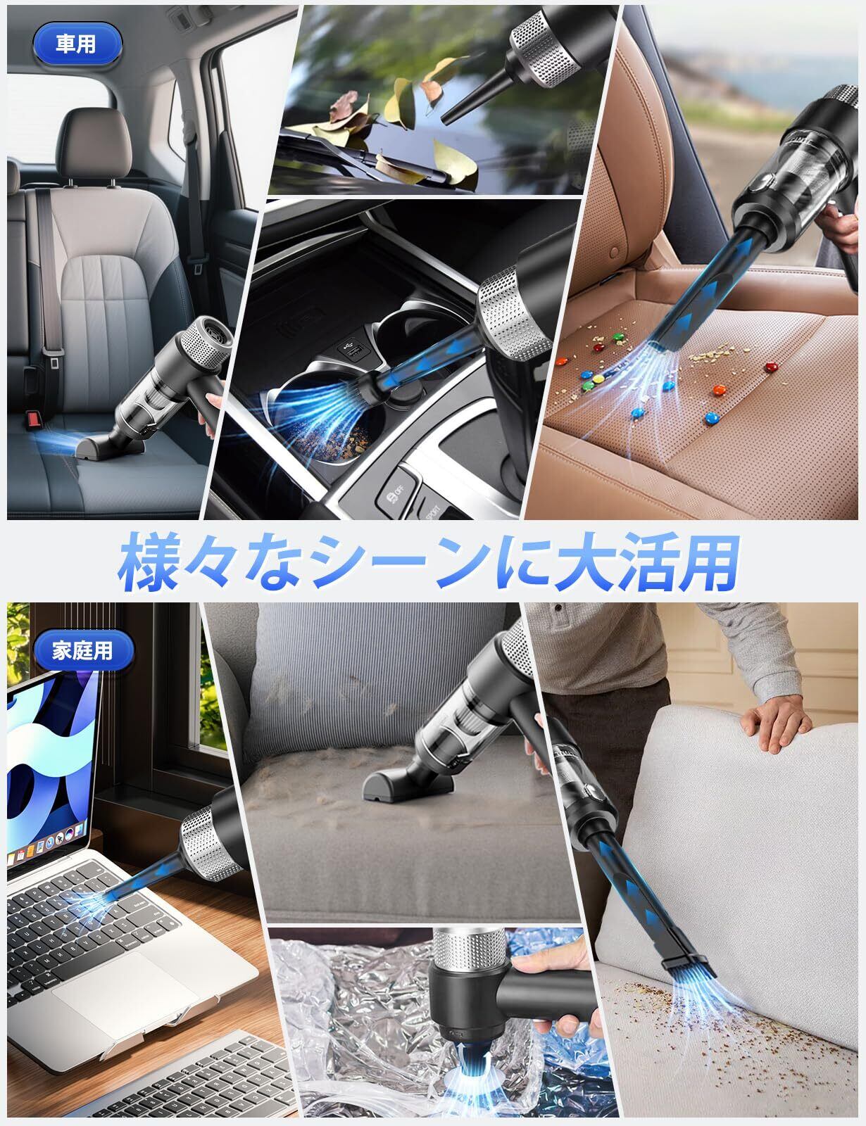 ■32000Paの強力吸引力!■この掃除機は、強力モーターによって実現した32000Paの吸引力で、髪の毛や細かいゴミも確実にキャッチ。車や家庭のさまざまなシーンで活躍し、クリーンな環境を保ちます。