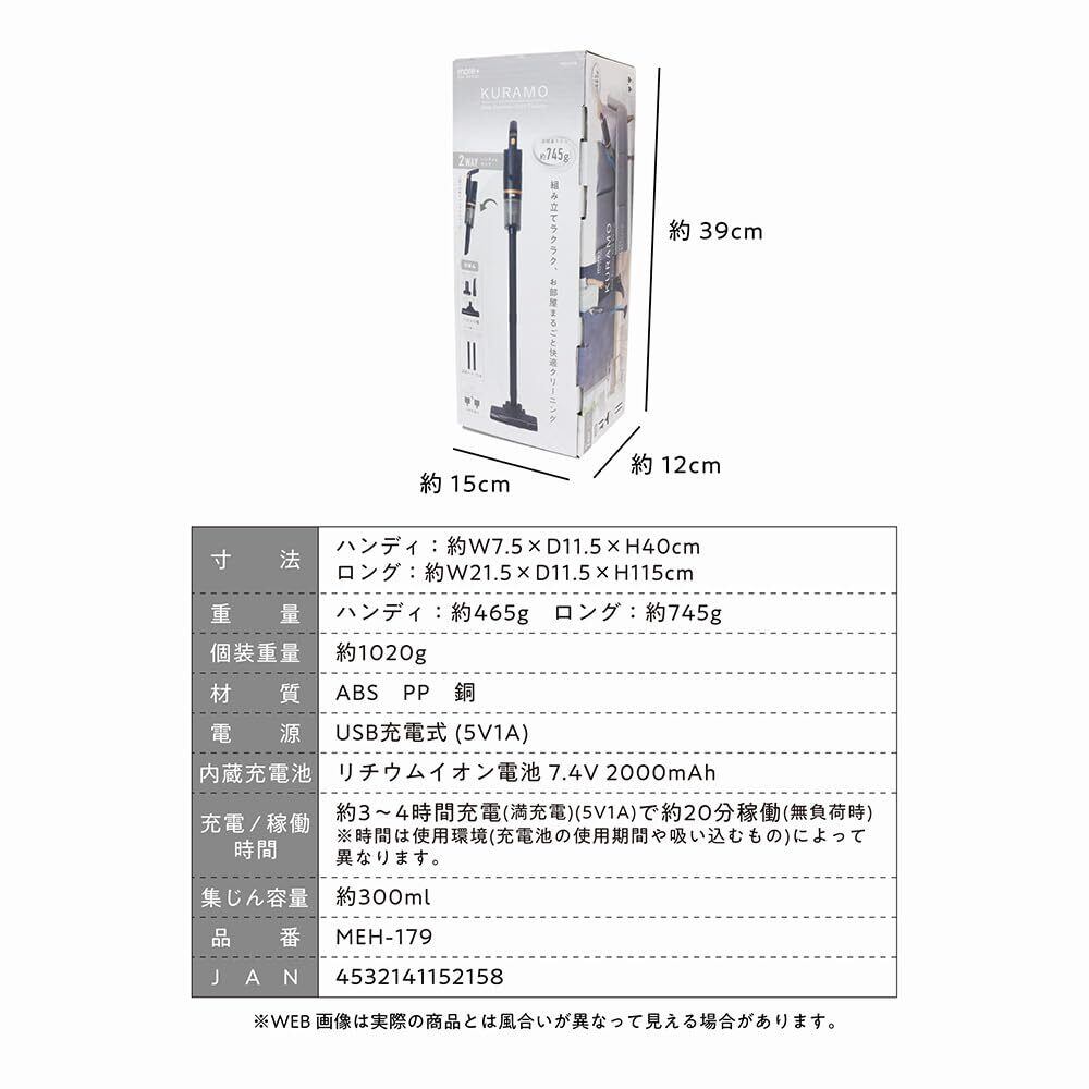 寸法:ハンディ:約W7.5×D11.5×H40cm、 :ロング:約W21.5×D11.5×H115cm、 重量:ハンディ:約465g、 :ロング:約745g、 個装重量:約1020g、 材質:ABS PP 銅、 電源:USB充電式 (5V1A)、 内蔵充電池:リチウムイオン電池 7.4V 2000mAh、 充電 / 稼働時間:約3〜4時間充電(満充電)(5V1A)で約20分稼働(無負荷時)、 ※時間は使用環境(充電池の使用期間や吸い込むもの)によって異なります。集じん容量:約300ml