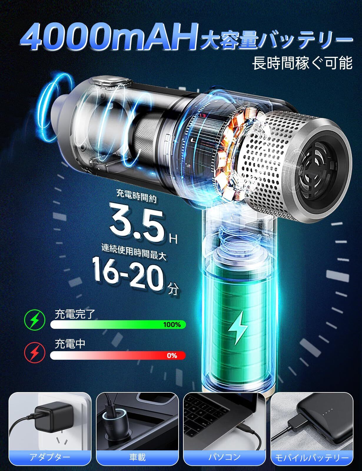 【抜群な吸引力ハイパワー・コンパクト掃除機】本車用掃除機はブラシレスの高速モーターを採用して、最大32000PAの強力な吸引力で、食べこぼし、タバコの灰、粉末の物、ペットの毛、髪や車の中の小石などを手軽にお掃除可能です。部屋の隅々まで届きます、掃除はすべてお任せください。 コードレス掃除機で、掃除する時にゴチャゴチャしているコードからの邪魔がなく、愛車のクリーニングをスムーズに行えます。