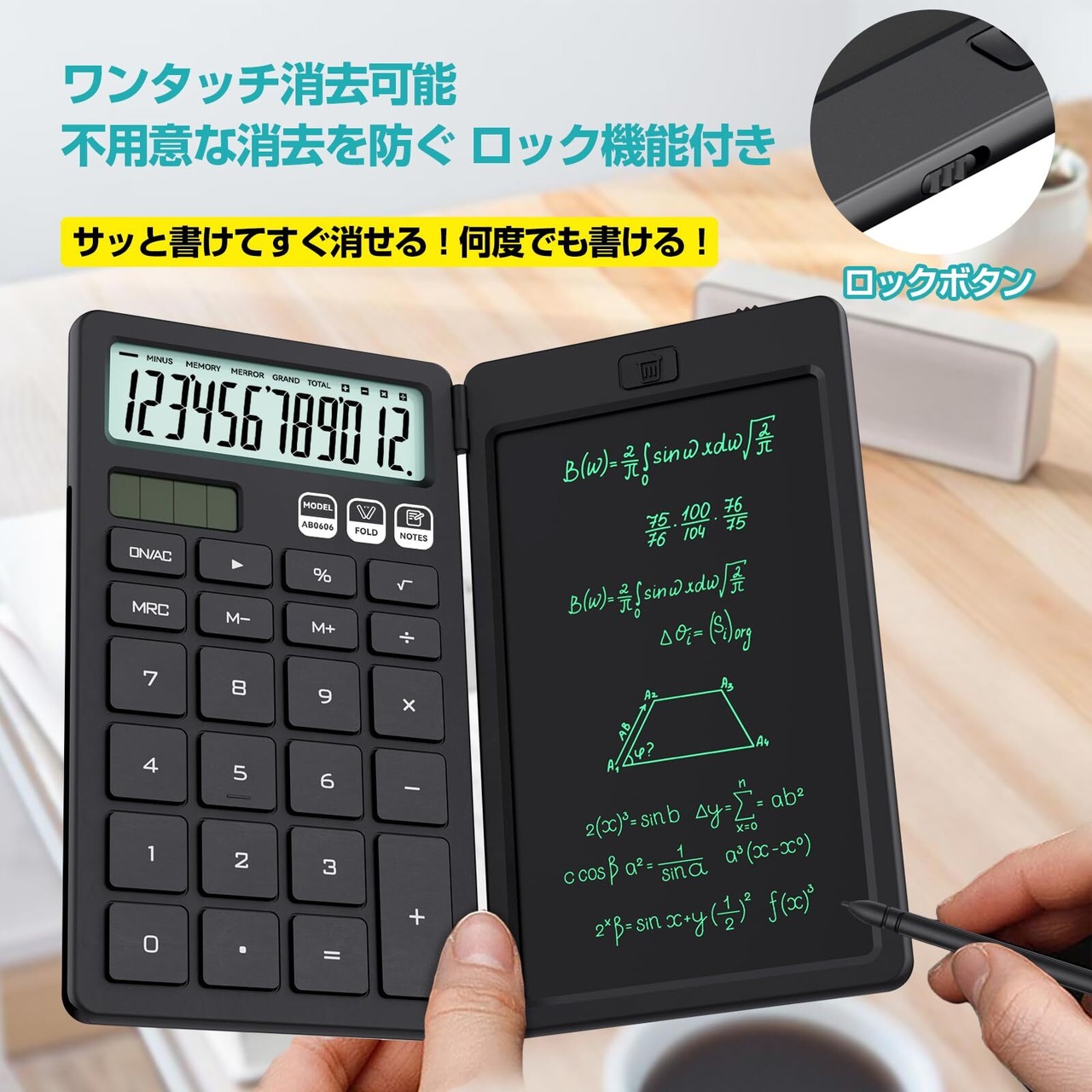 ①【電子メモ&電卓一体型・ワンタッチメモ消去】 電子メモパッドに電卓機能を搭載した便利なデザインです。一度のタッチでメモした内容をすぐに消去できます。また、メモロック機能により、計算結果や重要なメモを誤って消してしまう心配もありません。計算機のボタンは全て高品質なプラスチック製で、優れた触感とスムーズな反応を実現しています。