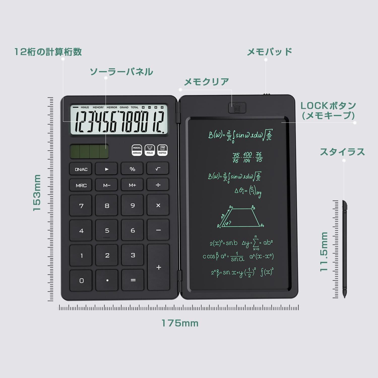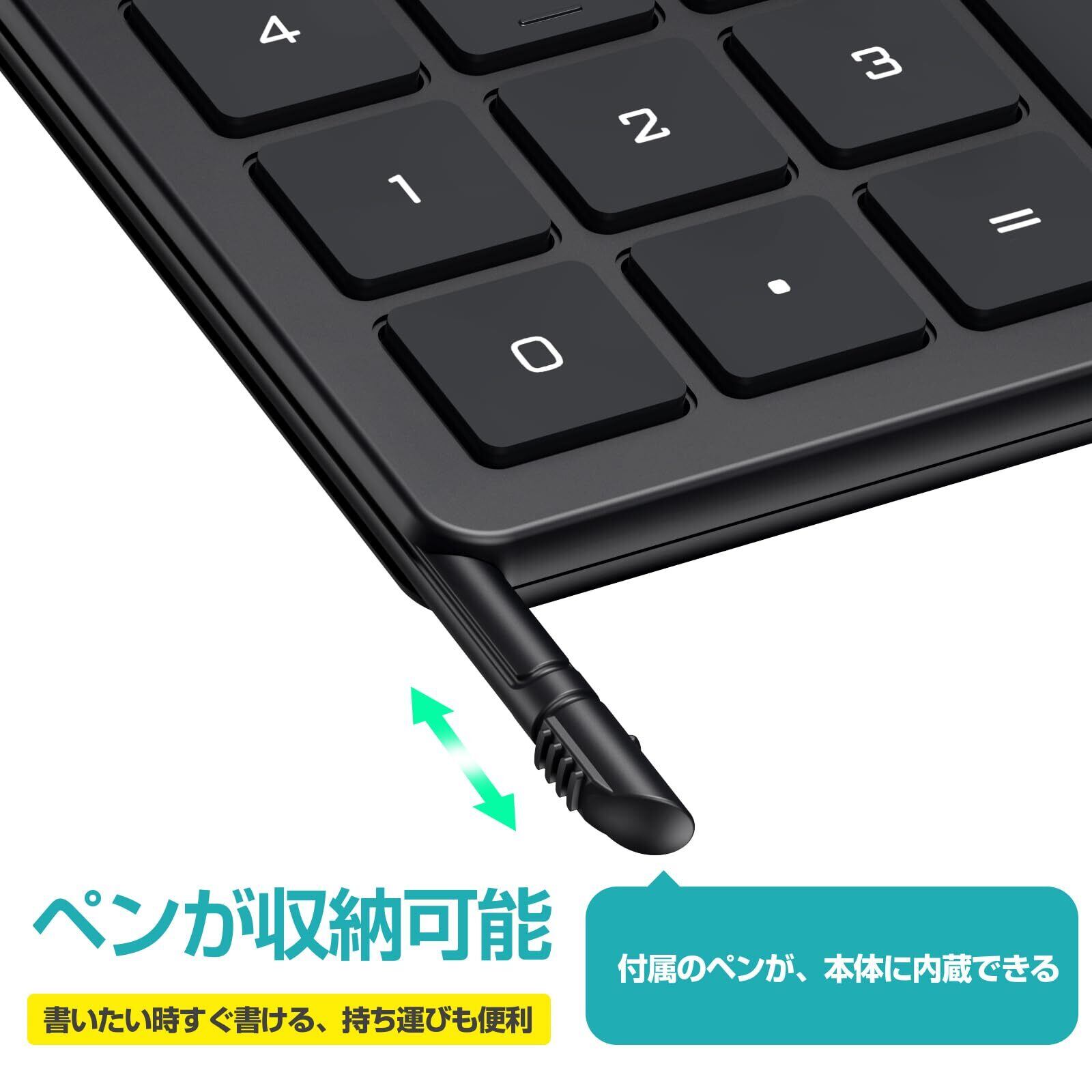 ④【軽量設計で携帯しやすい】 重量わずか173g、折りたたみ式デザインでコンパクトです。持ち運びに便利で、どこでも快適に使用可能です。電卓で作業しながら、付属のペンで6インチのメモパッドにスムーズにメモを取ることができます。