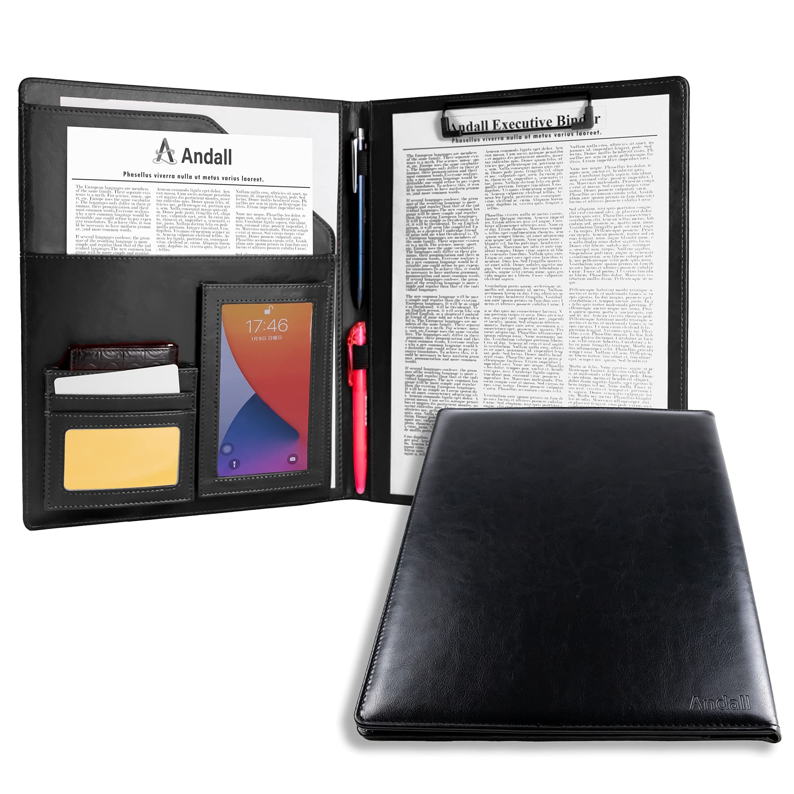 Andall 職人のこだわり バインダー A4 『ダブルペンホルダー・下敷付き』クリップボード 国内正規品 PU革 レザー調 二つ折り 多機能 名刺入れ プレゼント ギフト [アンダル] (黒/スマホ用ポケットタイプ)