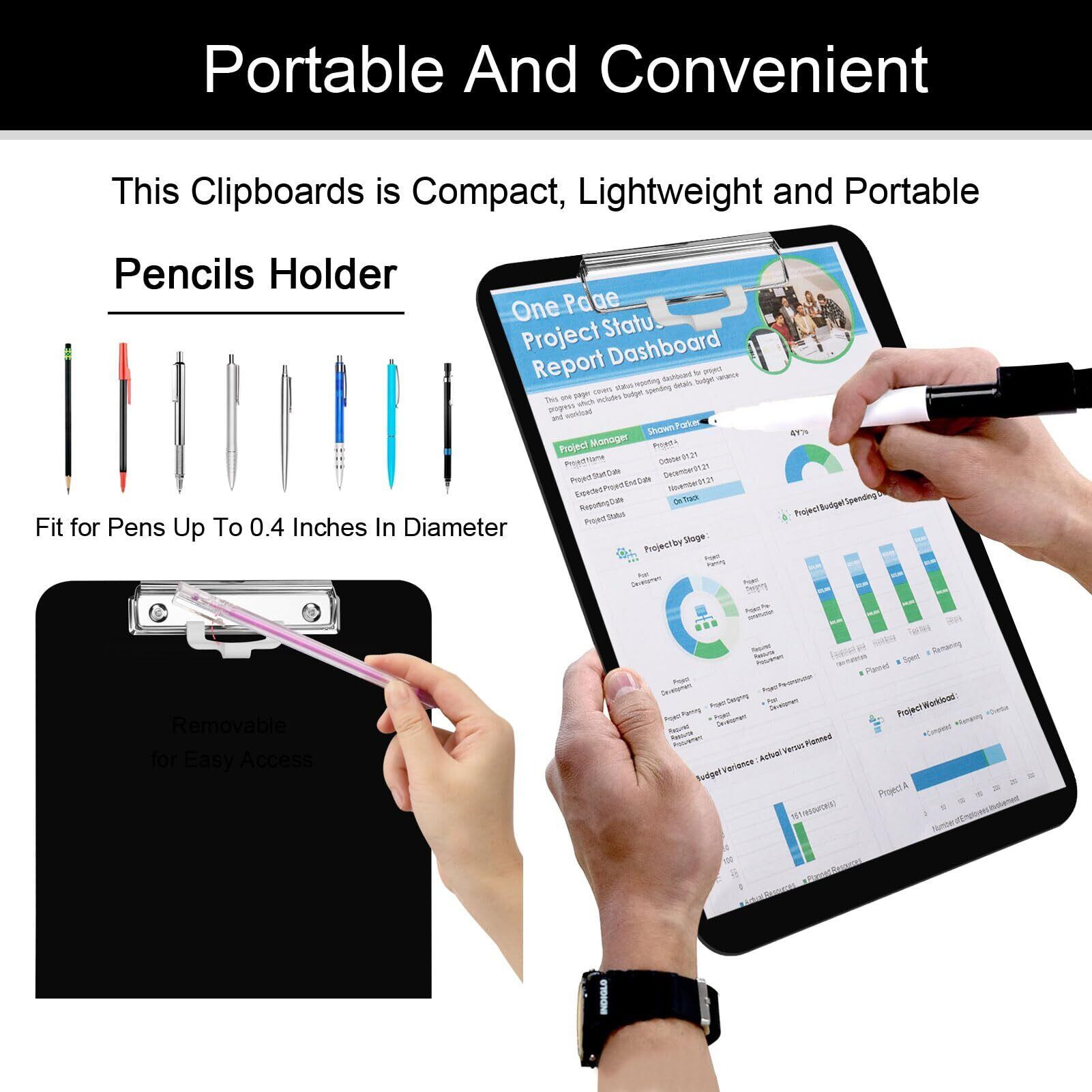 【思慮深いデザイン】:高品質のプラスチック素材でできており、防水性と防汚性があり、お手入れが簡単です。角が丸いデザインで、手を傷つけにくいです。丈夫なメタルクリップでしっかりホールドし、脱落しにくいです。コーナープロテクター付きで、紙が傷つきにくいです。