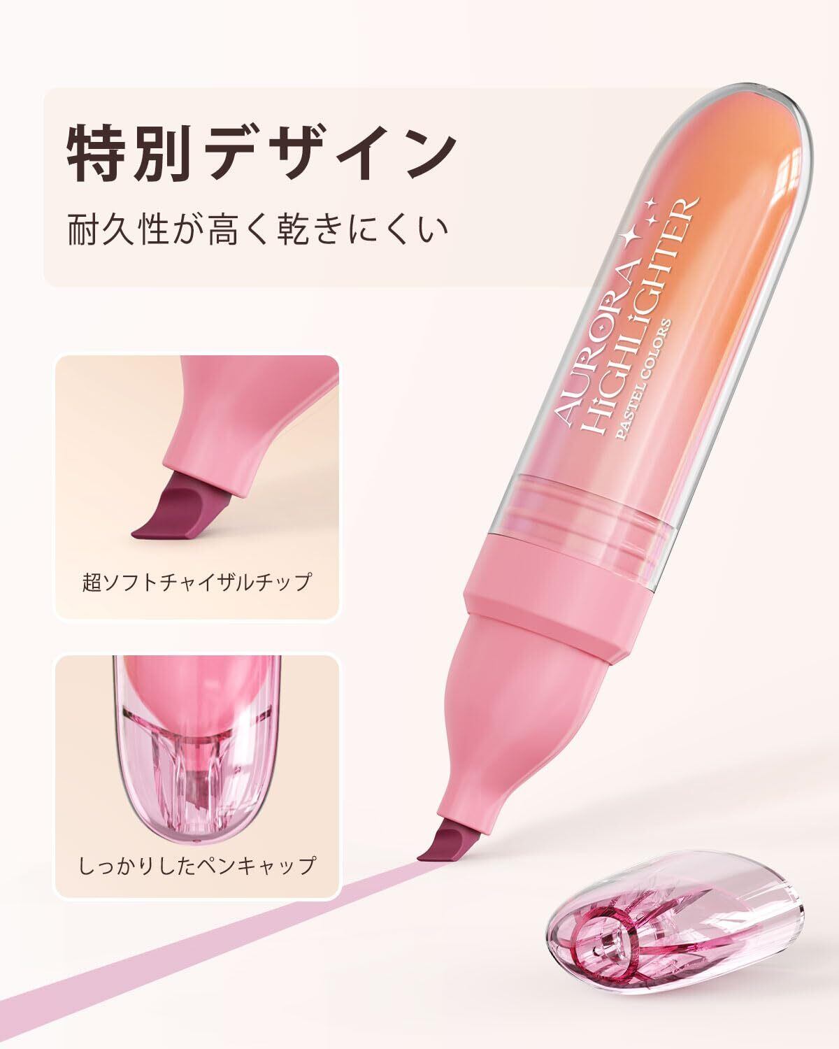 快適なデザイン: ソフトなチゼル型のペン先としっかりと密閉されたキャップを備えた蛍光ペンです。アクリル製のケースとグラデーションボディにより、快適な使い心地と美しい見た目を両立。握りやすいデザインで、長時間の筆記でも手の疲れを軽減します