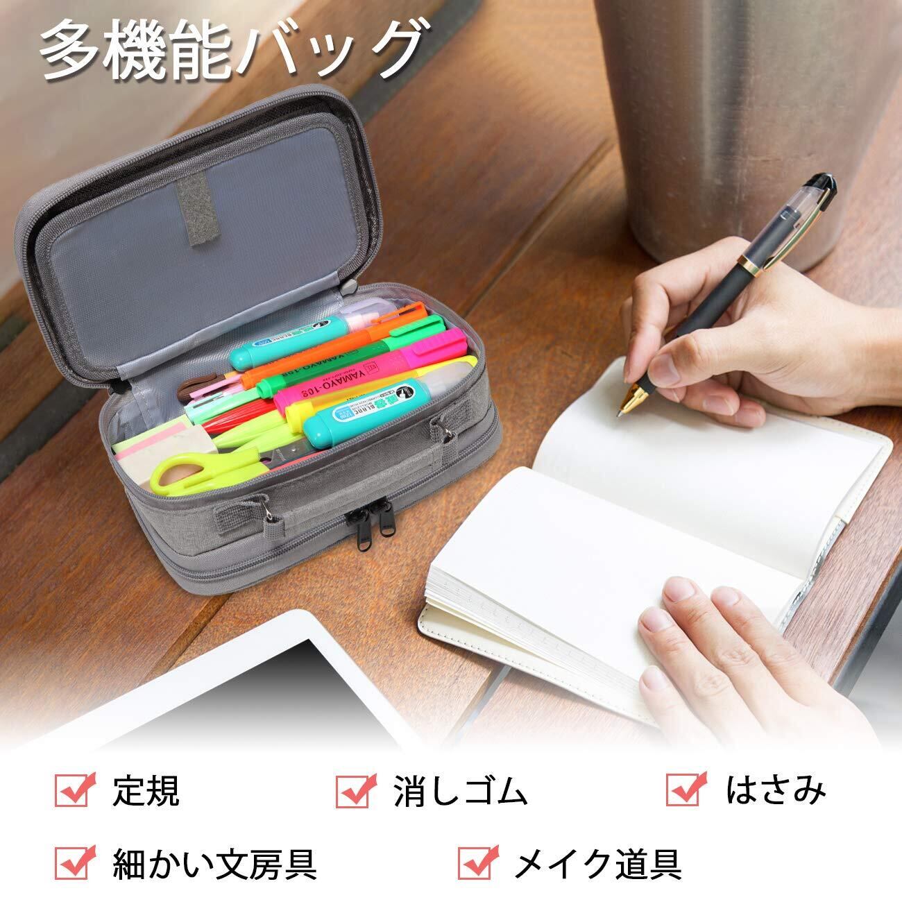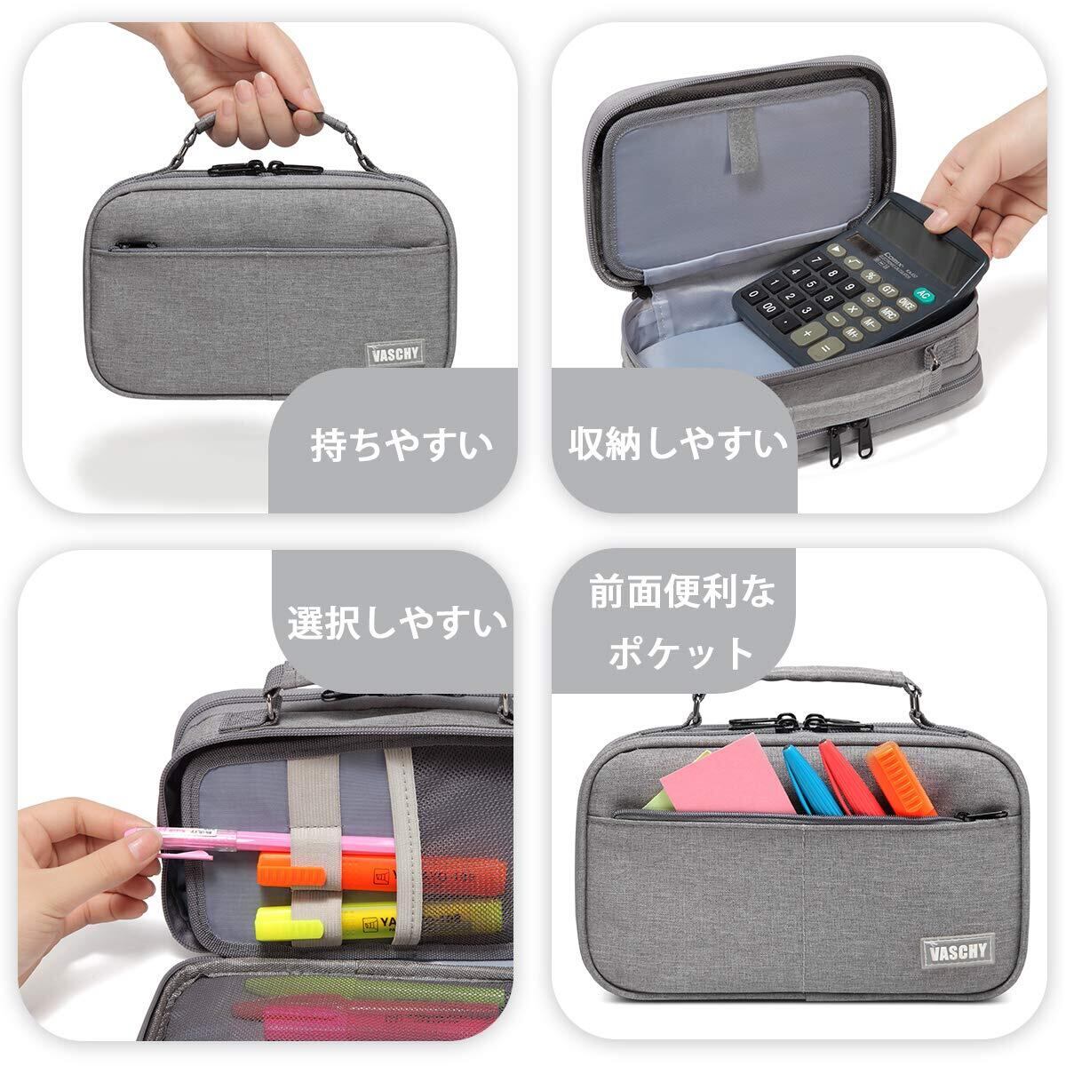 Vaschy 二階建て ペンケース 大容量 多機能 筆箱 学生用 社会人用 ペンポーチ 内ポケット 持ち手付き グレー