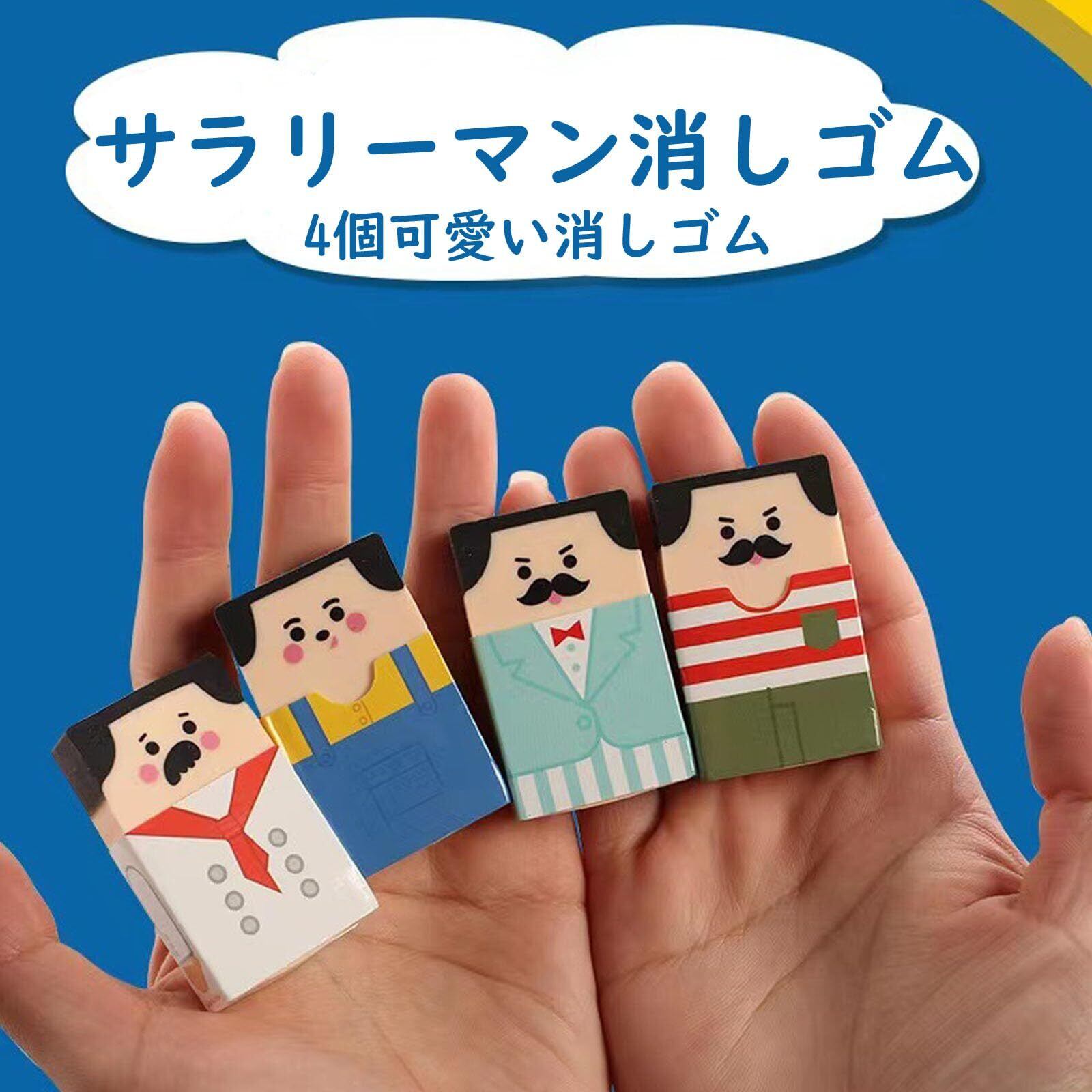【4個可愛い消しゴム 小学生】めちゃくちゃおもしろ消しゴムで、4つの職業、スーツの男、小学生、縞模様の男、料理人が特に可愛いです。ハゲが何とも言えません。通勤者にはたまらない。面白い消しゴムは中年男性が主役で、消しゴムを使うたびにハゲてしまう。消しゴムを多用すればするほど、中年男性は禿げていく。