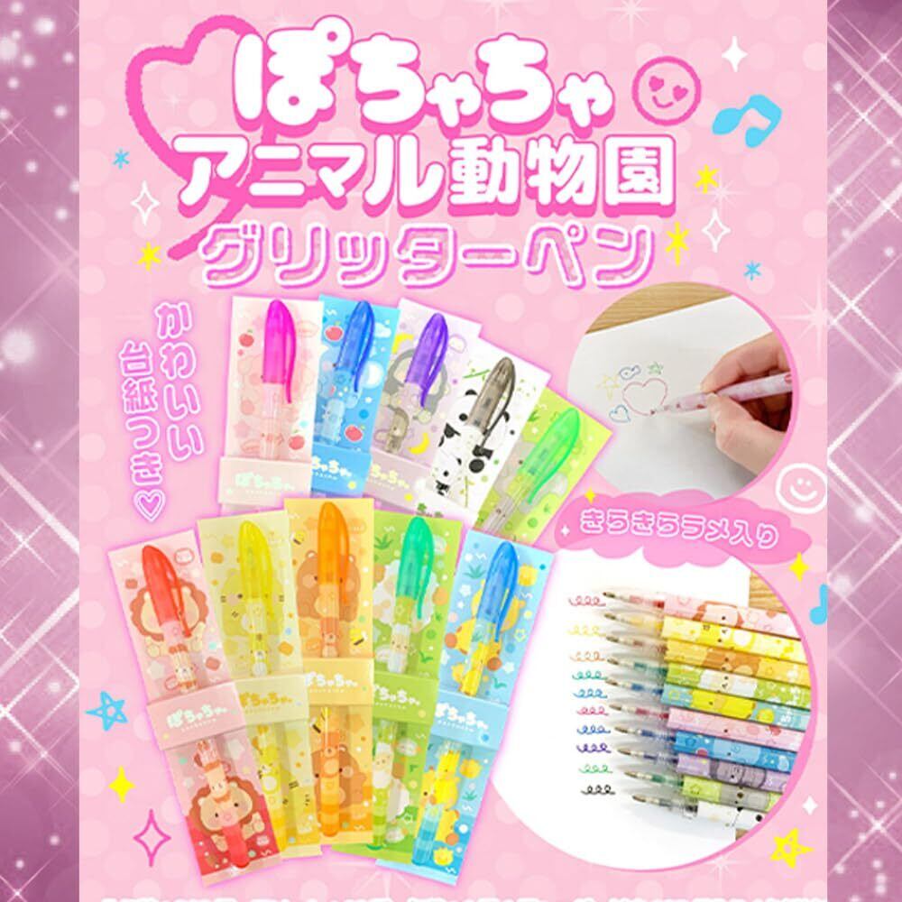 【可愛い動物たちと一緒に、キラキラした筆記の冒険へ!】「ぽちゃちゃ アニマル動物園 グリッターペン」は、愛らしい動物たちがデザインされたカラフルな水性ペンです。全10種類のデザインが揃い、それぞれが持つ独特の魅力で、毎日のメモや絵をより楽しく彩ります。