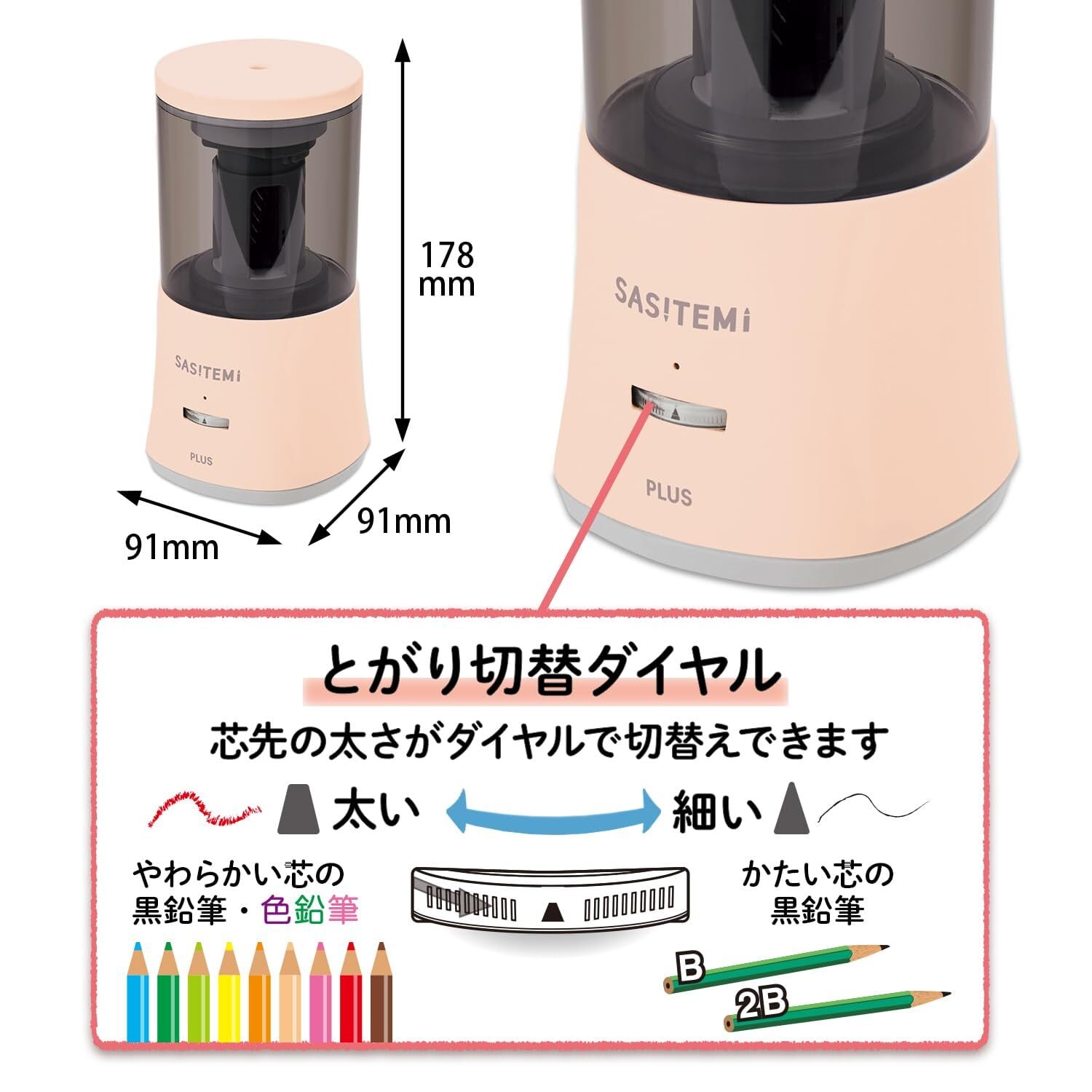 【手軽さとスピードを兼ね備えた電動鉛筆削り!】「プラス 鉛筆削り SASITEMI」は、上から鉛筆を挿すだけで簡単に削れるオートマチックタイプの電動鉛筆削りです。忙しい日常でもサッと使えて、ストレスなく鉛筆を整えられます!