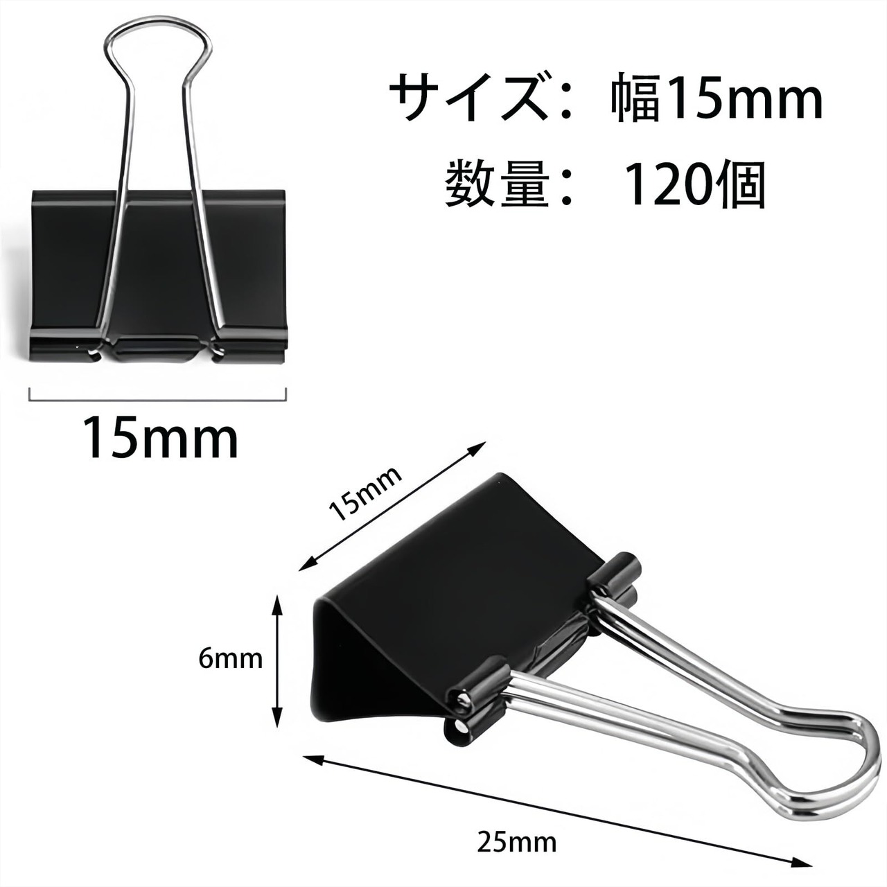 ダブルクリップ 中 15mm 120個入り 黒 金属製 ペーパークリップ 事務用クリップ 書類整理 オフィス 家庭用 業務用 文房具 お徳用 クリップ黒 袋止めクリップ