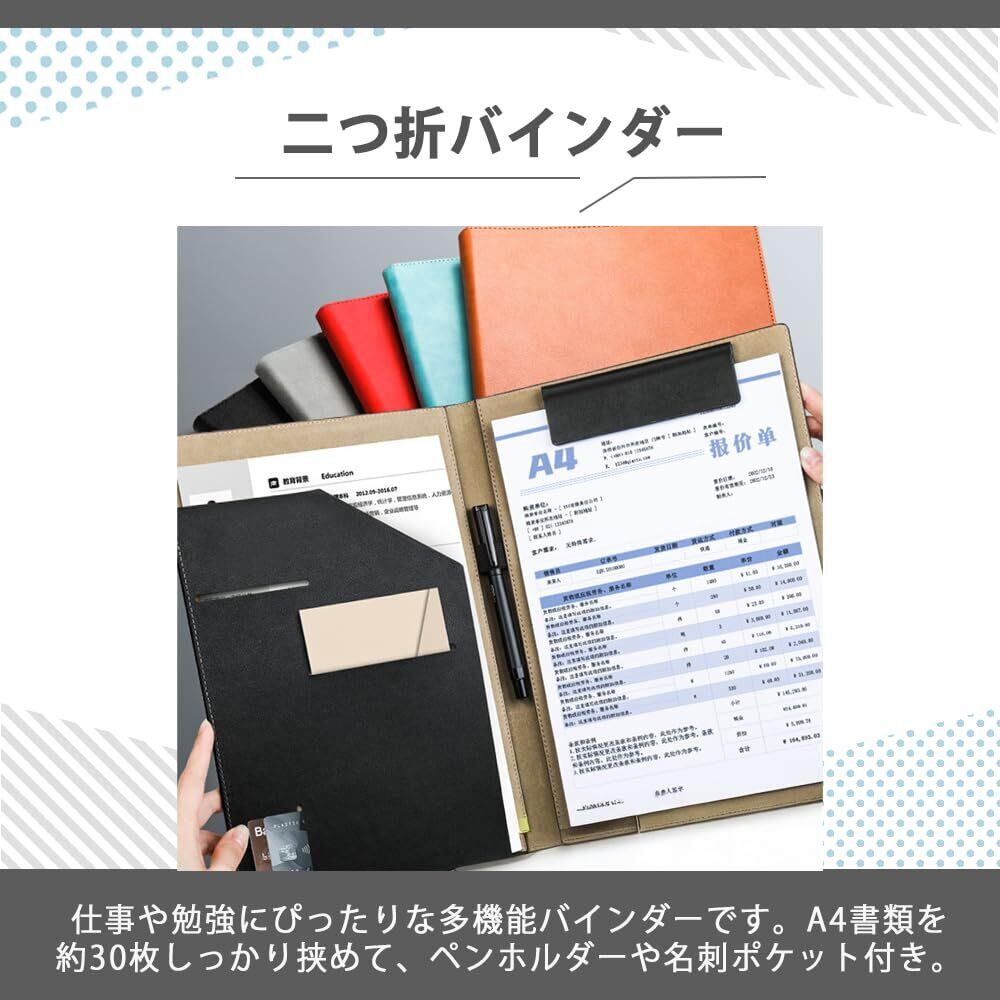 【二つ折バインダー】仕事や勉強にぴったりな多機能バインダーです。A4書類を約30枚しっかり挟めて、ペンホルダーや名刺ポケット付き。会議や外出先でもスマートに活用できます。
