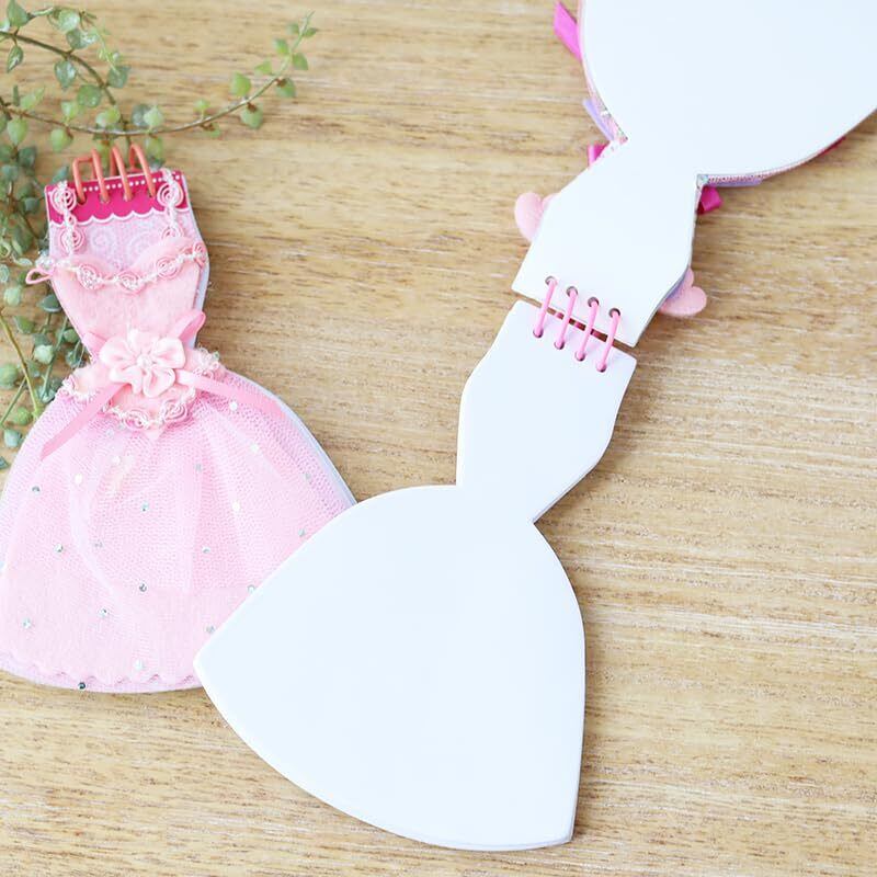 バレエ大好きな方に!発表会のお返しに!お誕生日プレセントに ドレス型ノートは、まるで美しいドレスをまとったかのようなデザインが魅力のノートです。 表紙には繊細なレースやリボンの装飾が施されており、持っているだけで気分が上がること間違いなし。 特別な日や大切な人へのギフトにも最適です。