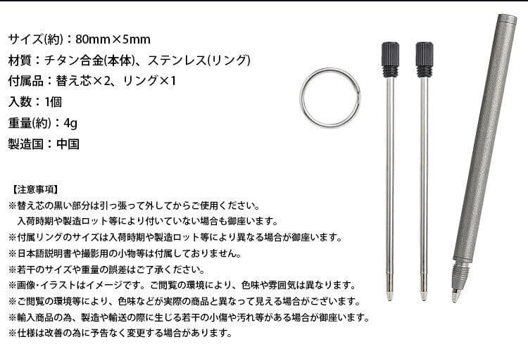 サイズ(約):80mm×5mm 材質:チタン合金(本体)、ステンレス(リング) 付属品:替え芯×2、リング×1 入数:1個 重量(約):4g