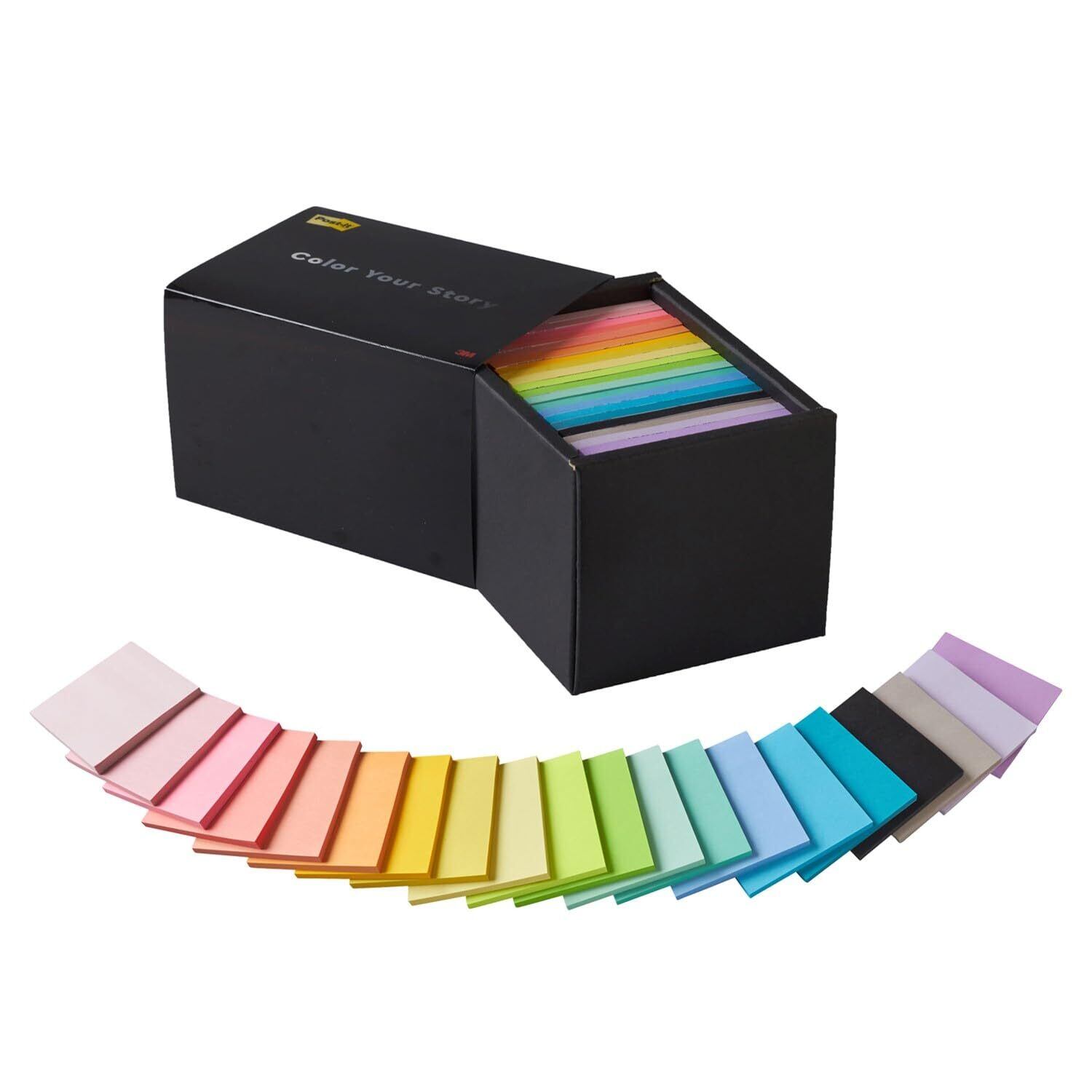 【ポスト・イット 強粘着ノートの20色セット】鮮やかな色から落ち着いた色まで、ブラックを含む20色セット。全色が見渡せて好きな色が取り出せる、黒色のケース入り。