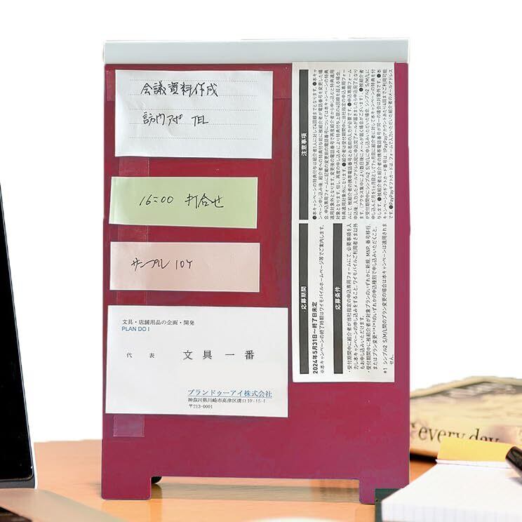 支払い表やメモ書きなど、忘れずにしたいものを卓上で綺麗に目立たせて整理ができます。紛失防止にも。