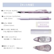 【セット内容】①シャープペンシル モノグラフ(0.5mm)、②シャープペンシル モノグラフライト(0.5mm)、③消しゴム MONO(幅23mm×全長55mm)、④スティックのり 消え色ピットS(容量10g)、⑤修正テープ モノエアー(5mm幅×10m)、⑥テープのり ピットパワーC(8.4mm×7m)
