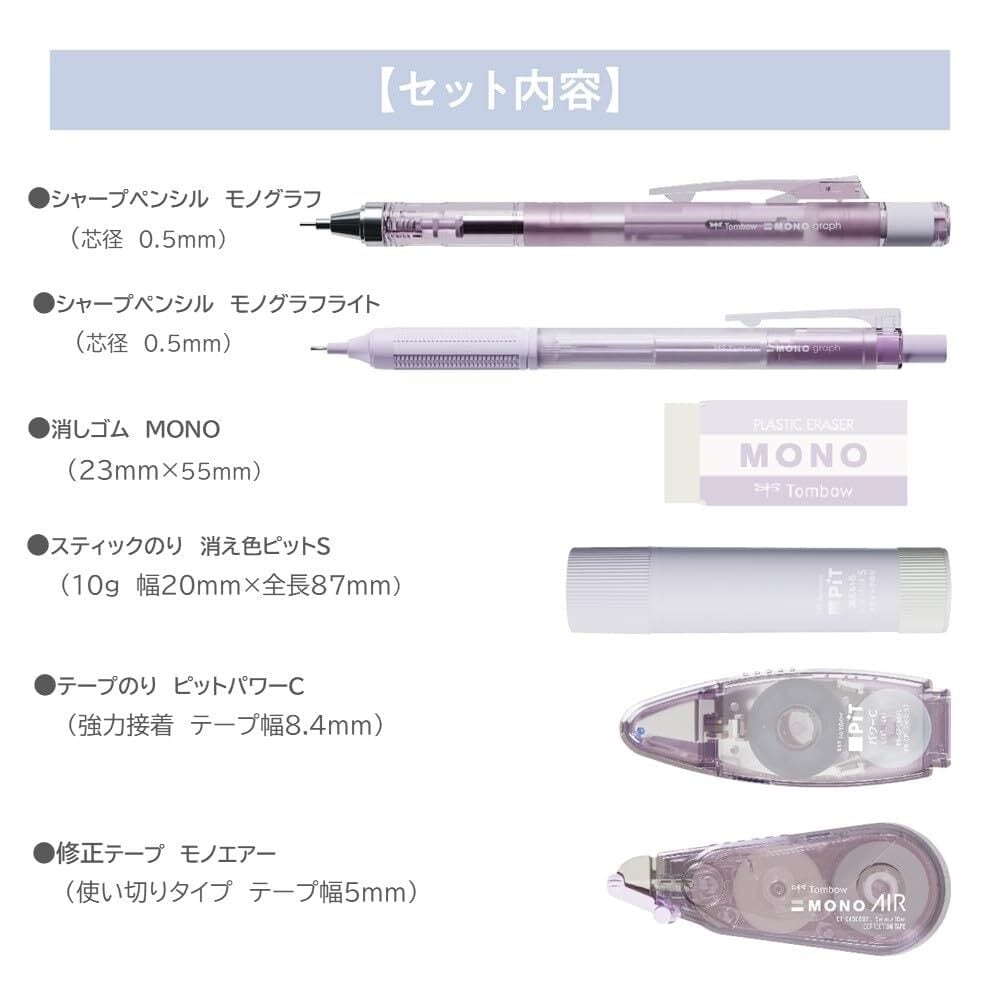 トンボ鉛筆 MONO × PiT 文房具セット パステルグラス パープル 6点セット (シャーペン0.5mm×2本 消しゴム スティックのり 修正テープ テープのり) PCC-644EAZ