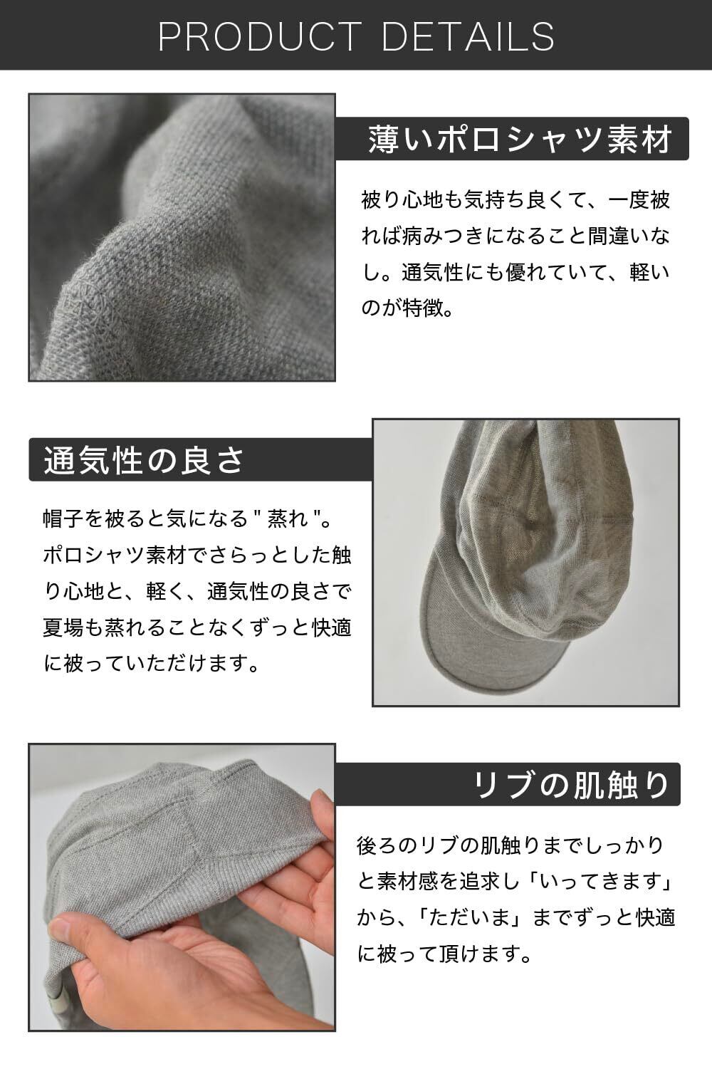 【帽子を被ると気になるのが"蒸れ"】その蒸れが気になって、中々一日中被るのがきつい…なんて経験はございませんか?そんな声をたくさん聞いて生まれたのがこの「ポロメッシュワークキャップ」。薄いポロシャツ素材のため、柔らかくてさらっとした触り心地。軽くて通気性も良いため、夏場でも蒸れることなく快適に被っていただけます。