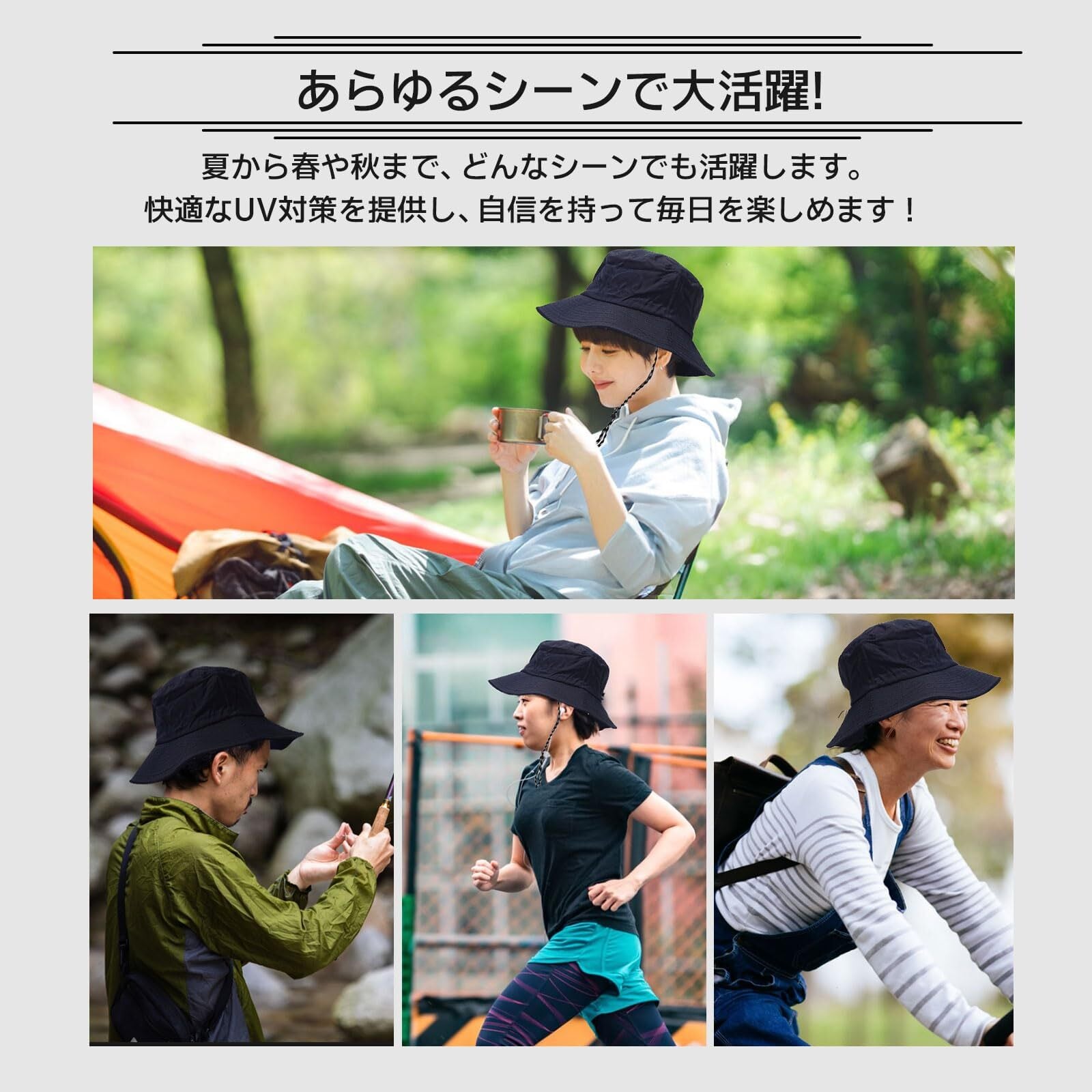 ■しっかりした紫外線対策!■ UPF50+の紫外線カット機能により、肌を守りながら快適に外での活動を楽しめます。特にサファリやキャンプ、ガーデニングなど、様々なシーンで活躍する頼もしい帽子です。