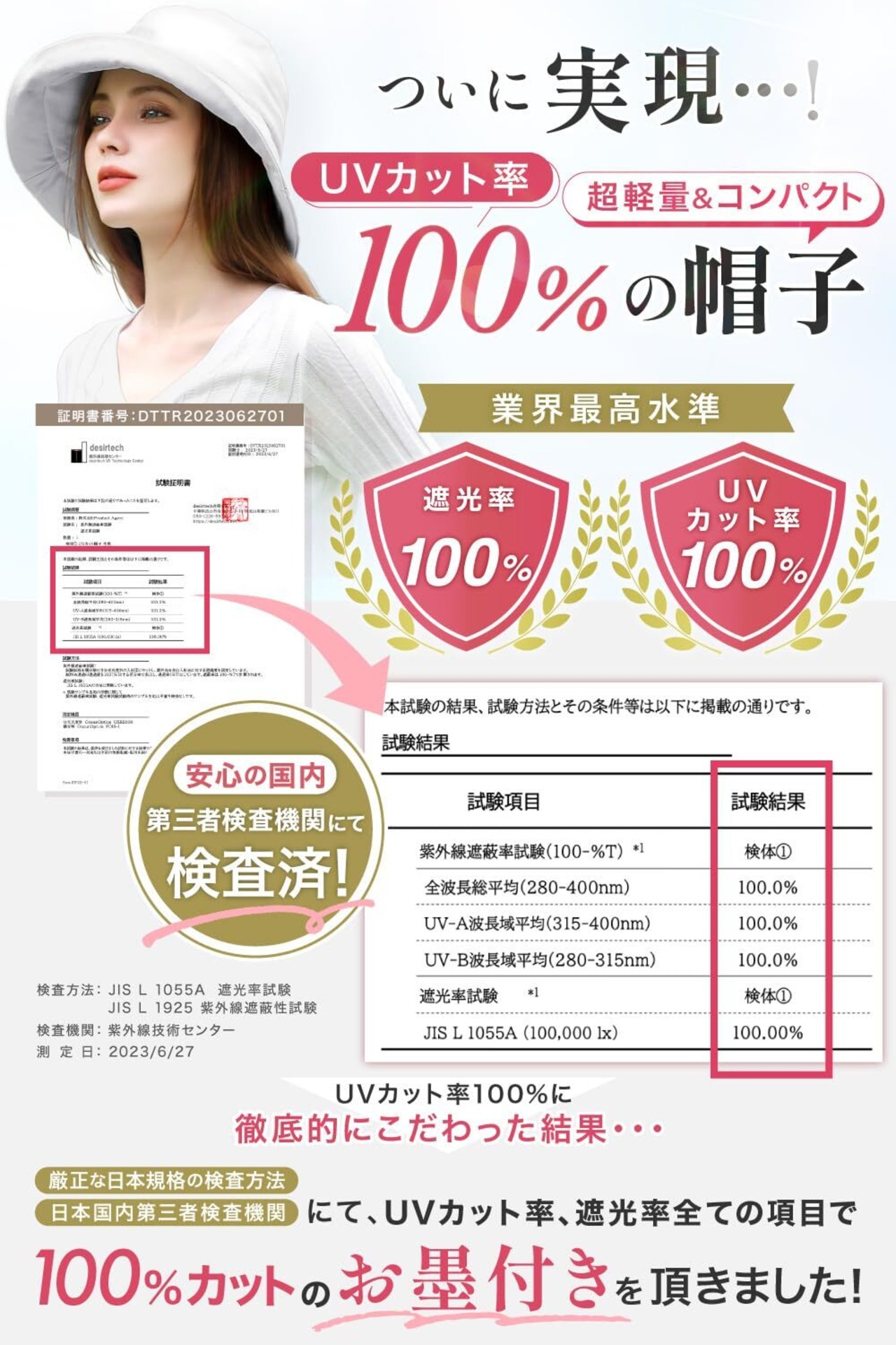 【国内第三者検査機関にてUVカット率100%の認証済】日本の国家規格、JIS規格1925にてUVカット率100%を認証。JIS規格1055にて遮光率100%の認証済み!完全遮光のレディースハットです。