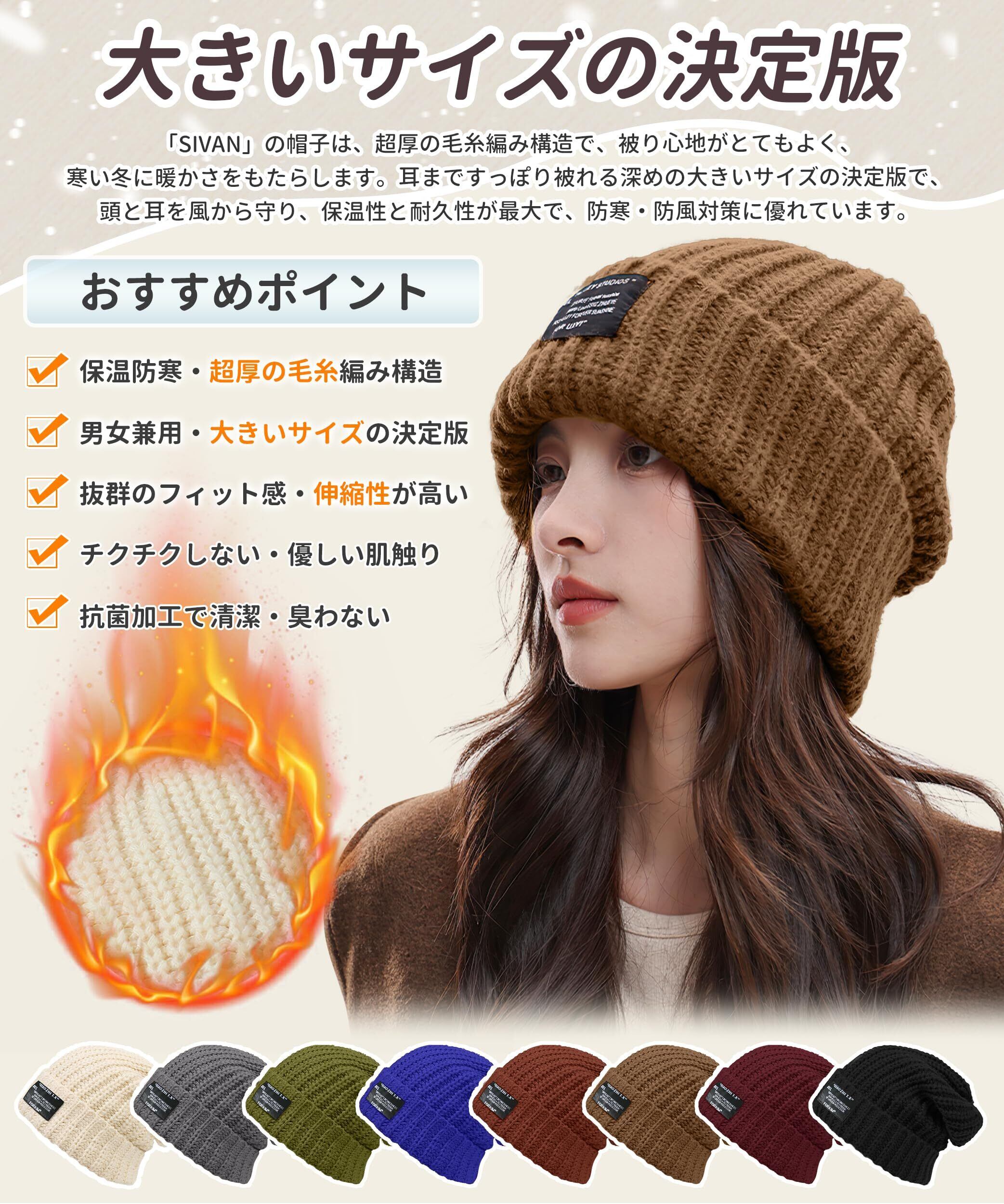 [SIVAN] ニット帽 メンズ レディース 冬 防寒 【大きサイズに最適な選択!】 【極厚の毛糸で断熱性 伸縮性・抗菌防臭】 厚手 暖かい 伸縮性 小顔効果 肌に優しい ニット帽子 防寒ニット帽 帽子 無地 通勤 通学 男女兼用 フリーサイズ