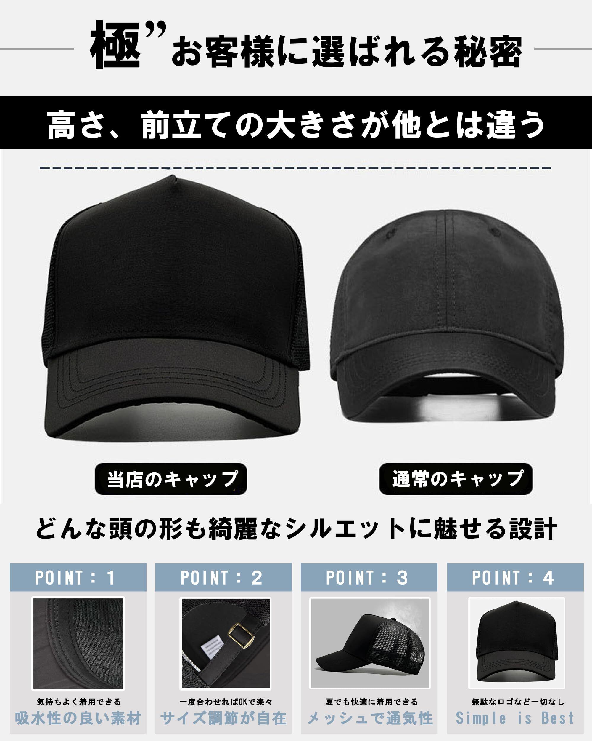 かぶり心地が深めに作られた、シルエットが綺麗な無地のメンズ用メッシュキャップ。 アジャスターでしっかり調節できて安定感のあるかぶり心地です。