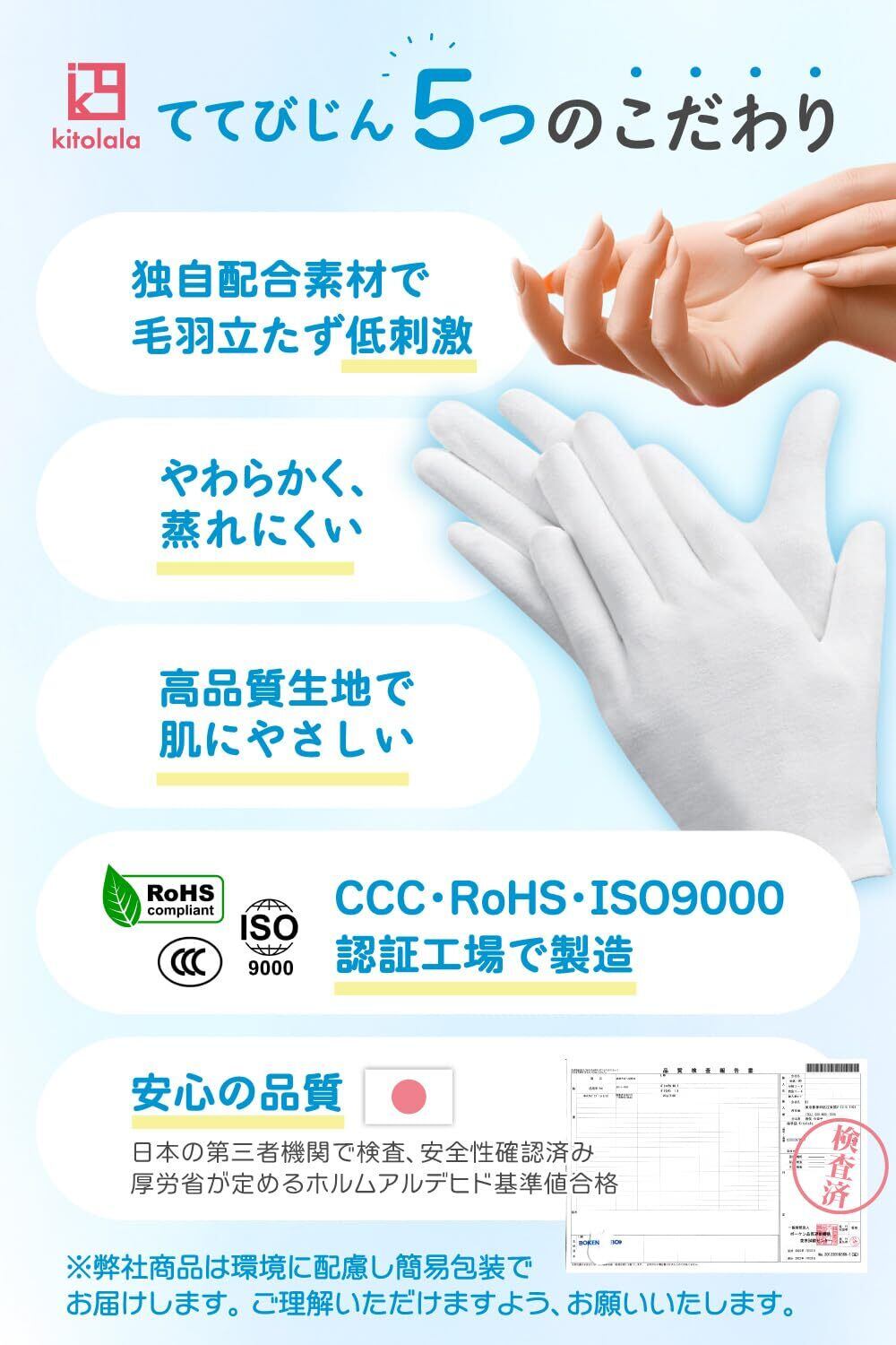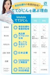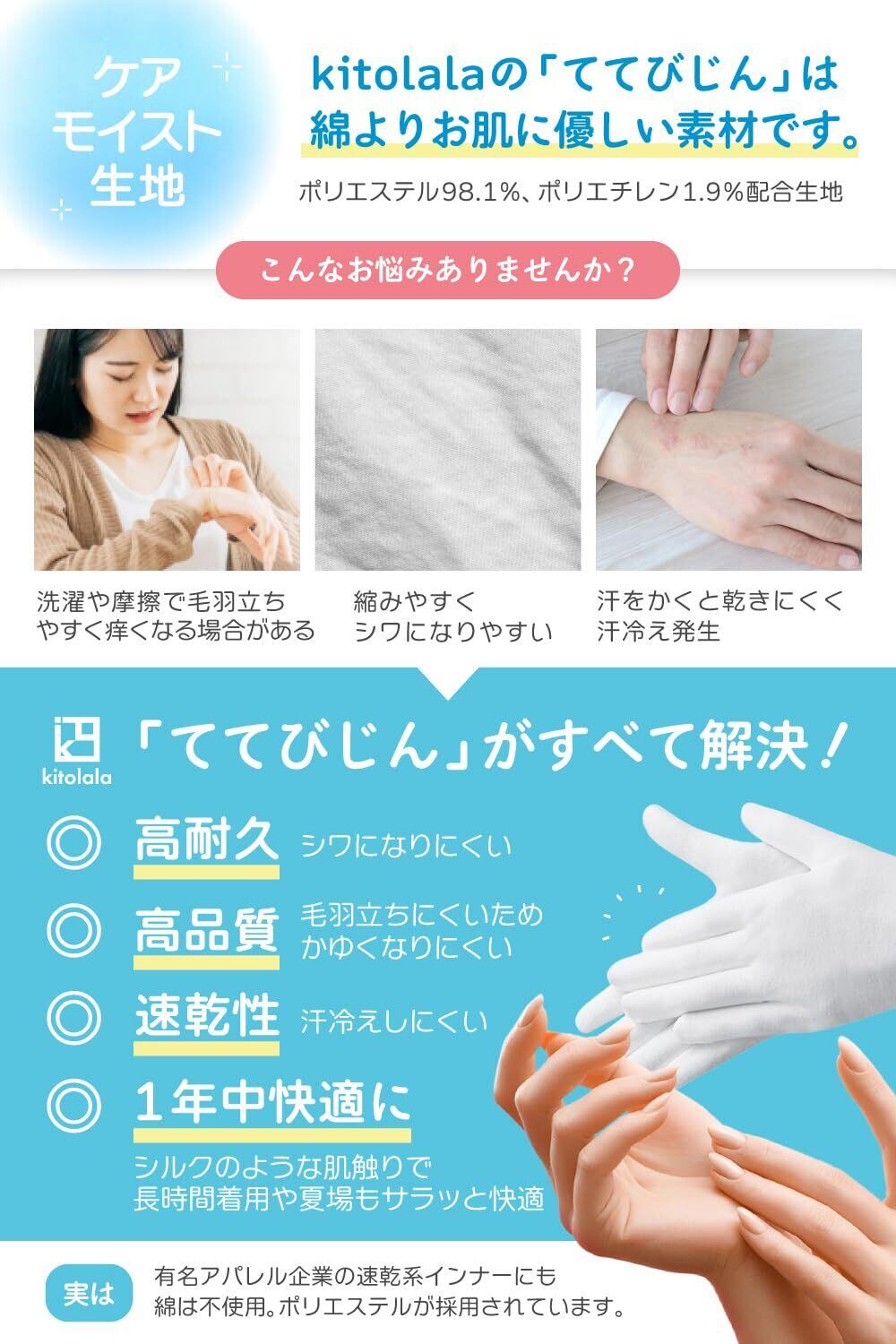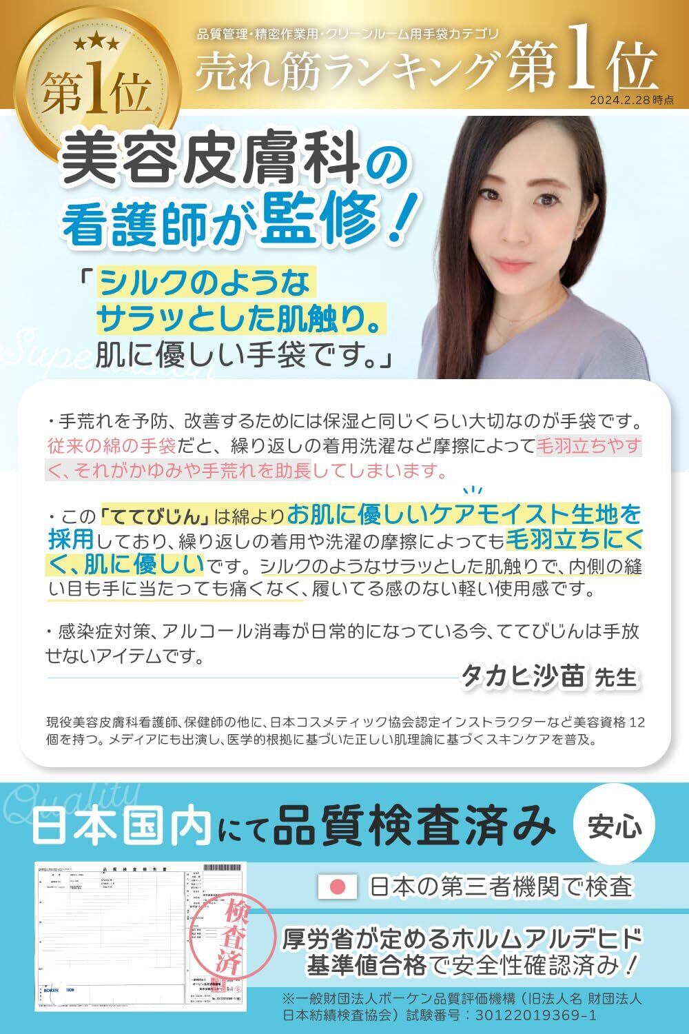 【美容皮膚科看護師監修】綿よりお肌に優しい高品質生地を採用しております。そのため繰り返しの着用や、洗濯の摩擦によっても毛羽立ちにくく、痒くなりにくく、敏感肌の方にもお使い頂けるお肌に優しい素材を使用しています。 手首部分も無縫製のため痒くなりにくく、手荒れを気にされている方に安心してご使用頂けます◎