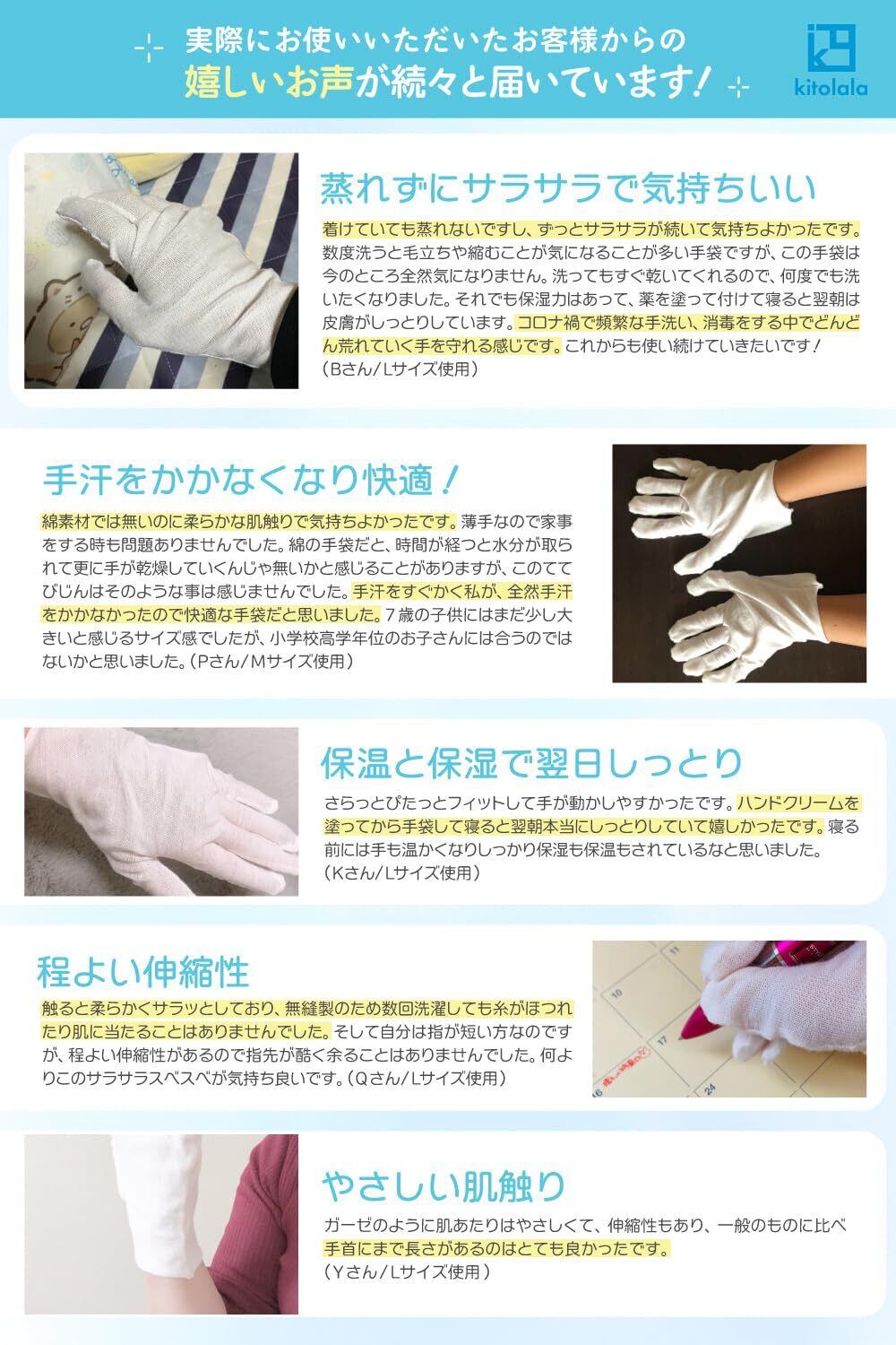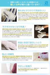 【肌ざわり】シルクのようなサラッとした肌触りで、履いてる感のない軽い使用感です◎ 手首の端は無縫製のため痒くなりにくく、内側の縫い目も手に当たっても痛くなく、綿手袋のような毛羽立ちやごわつきもありません◎ ゴム手袋などのアンダーにピッタリ◎ ハンドクリーム後の手の保護やガーデニング、お掃除にも便利です◎