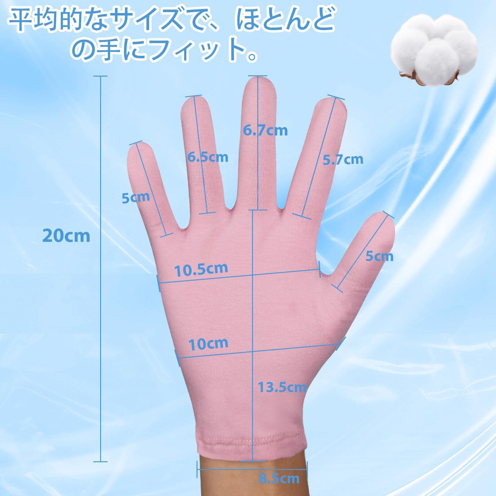 ■優れた保湿力でしっとり潤う!■ この手袋は、しっかりとしたモイスチャー機能を持ち、ハンドクリームと一緒に使用することで、手の乾燥を防ぎ、健やかな手肌を保ちます。おやすみの際に着用することで、翌朝にはふっくらとした手を実感できることでしょう。