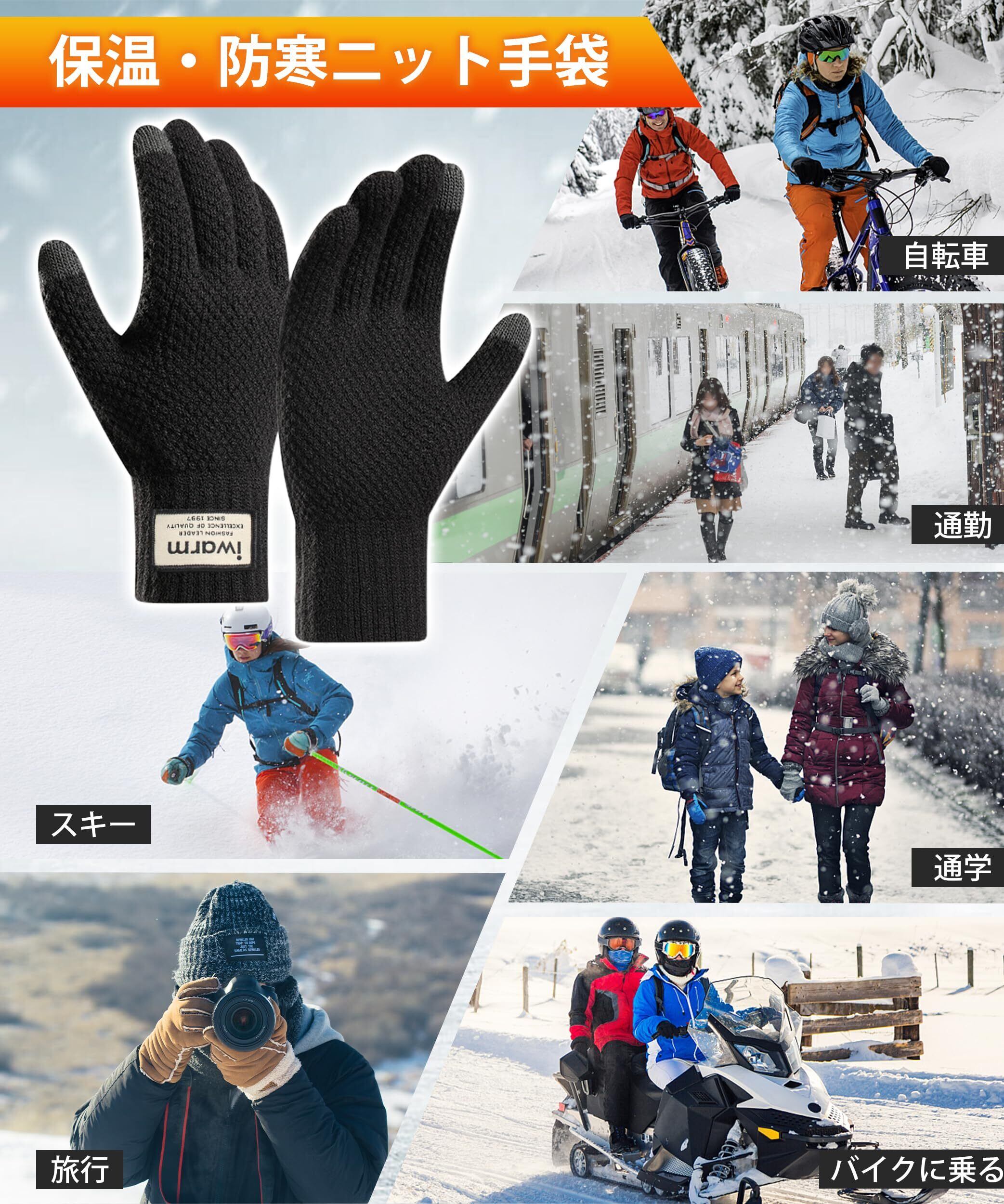【暖炉のように温かい】:暖炉のように暖かい手袋、手袋 メンズは二重構造で、表面は保温性が高いアクリル繊維を素材に、裏地はスパンデックス、柔らかい風合いと保温性を実現する! 手袋をすると、瞬時に温度が5℃上がり、寒い冬の日でも安心!裏面には柔らかい裏起毛、熱を閉じ込めやすく、肌に優しく快適な着心地を実現している防寒手袋です。ふわふわの裏起毛が指先まであり、手全体から指先までしっかり温めてくれます。防寒手袋、強化された袖口、伸縮性よく、締め付けません。冷たい風の侵入を防止する同時に、動きで簡単に外れません、 ふわふわで手に着けた瞬間暖かく実感できます。保温ニット手袋は寒冷な屋外の必需品です!
