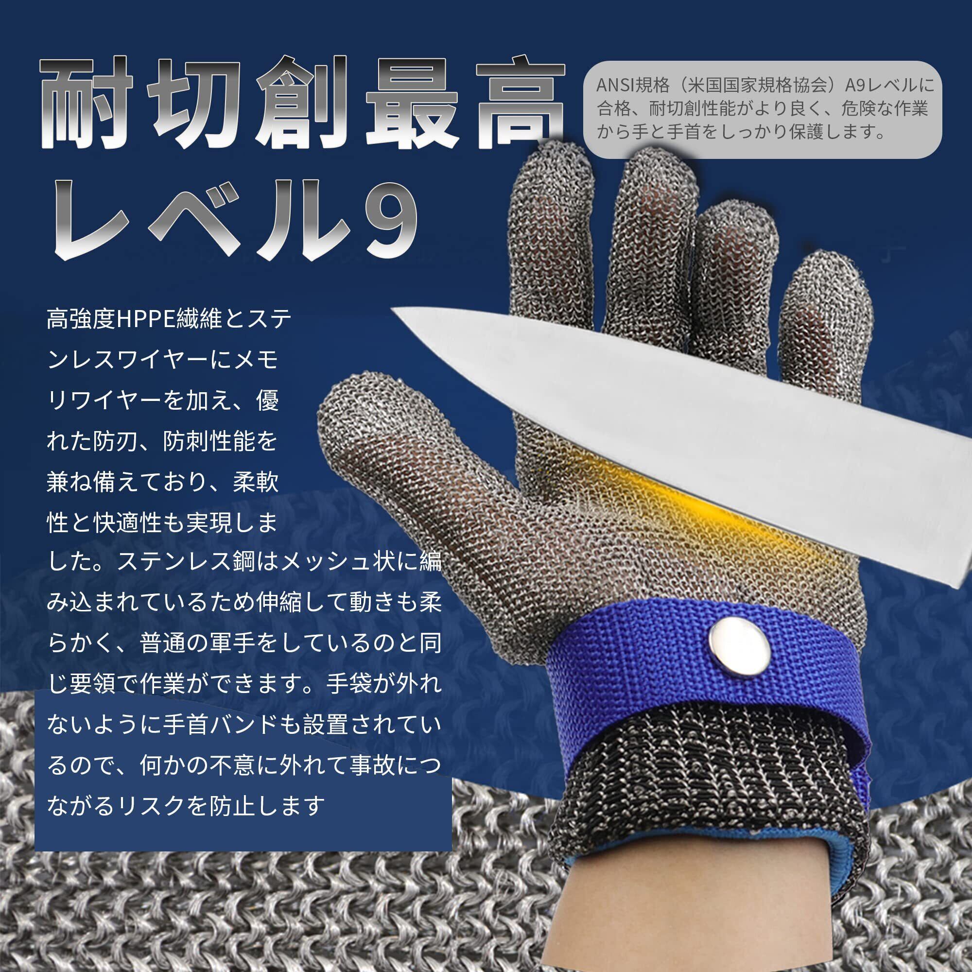 【安全性が抜群!】この防刃手袋は防刃レベル9の高い安全基準をクリアしており、切り傷から手をしっかりと守ります。ステンレス鋼メッシュが使用されたこの手袋は、鋭利な物にも耐えることで、作業中や料理の際も安心してご使用できます。