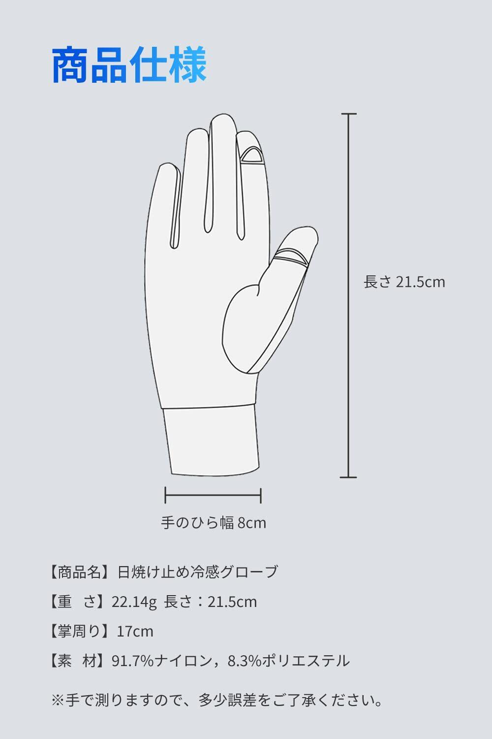 【優れた細部デザイン】速乾性にも優れる素材で、接触冷感材質、水や汗で濡れると気化熱の作用により冷却効果があり、肌と接触した瞬間に温度を3-5度を下がる涼しい冷感を与えます。指出し縫製タイプですので、手袋を付けたままスマホに操作できて便利です。通勤やドライブ、ガーデニングなど細かい手作業の時にも便利なアイテムです。