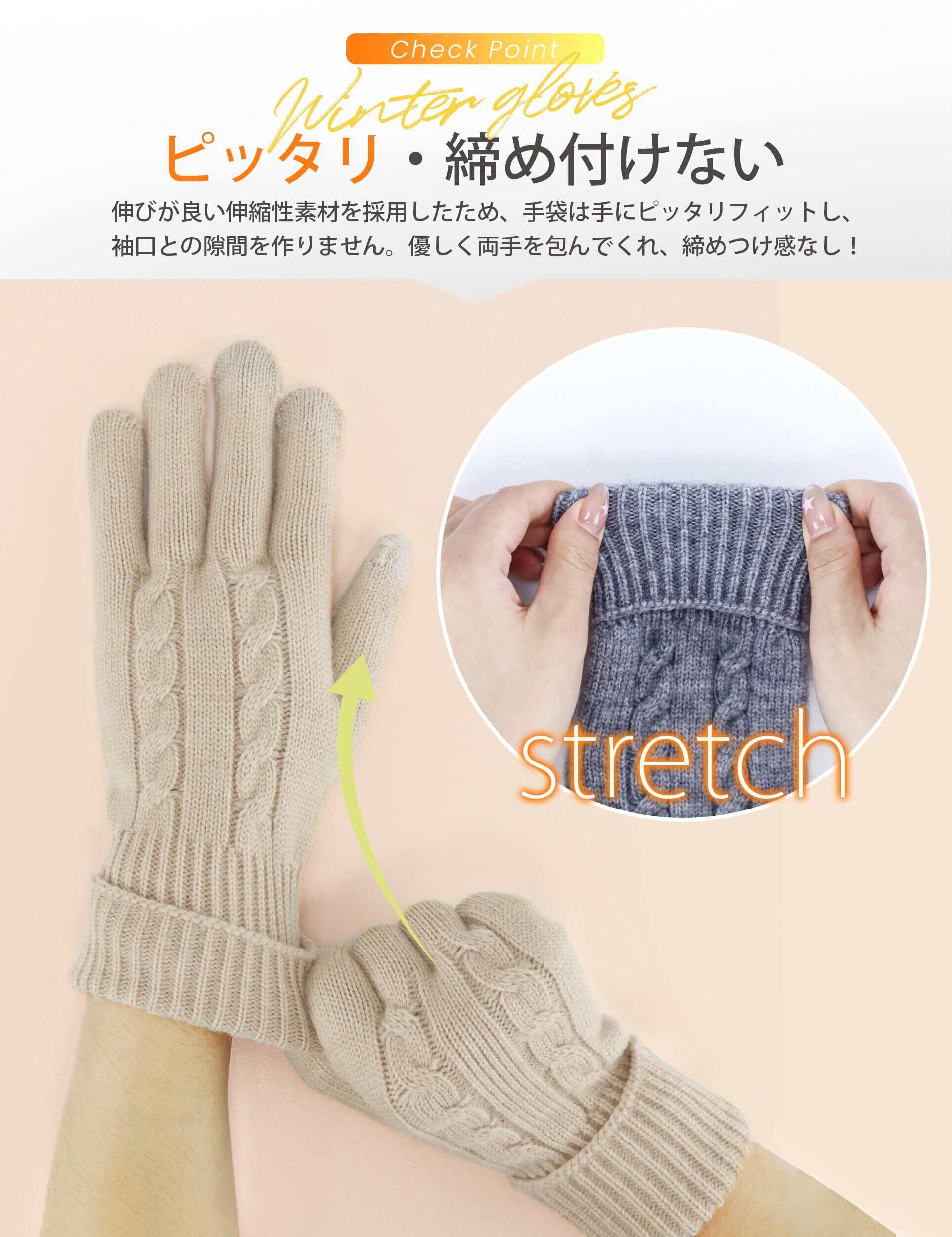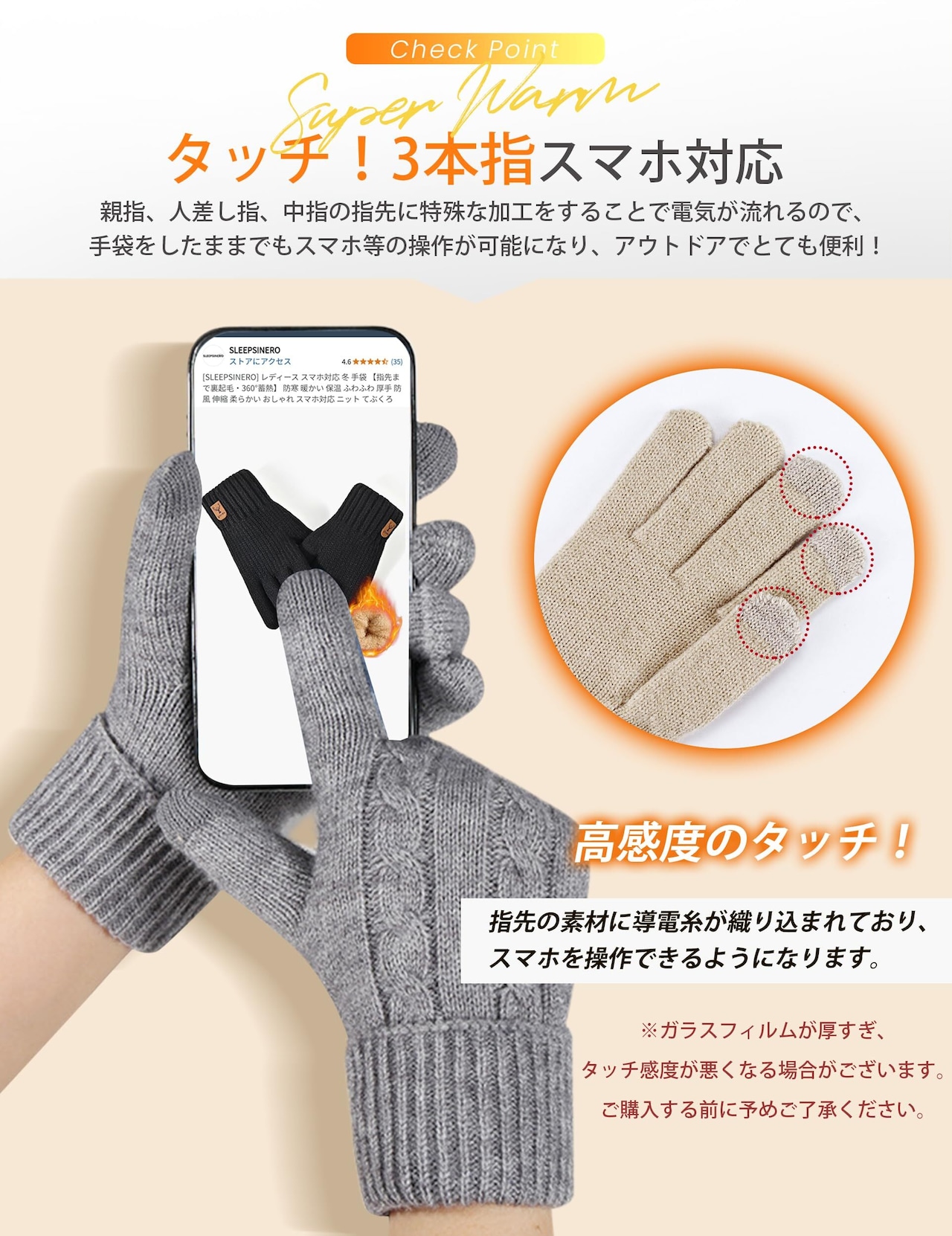 [SLEEPSINERO] 手袋 防寒 レディース スマホ対応 【360°暖かい裏起毛!3本指タッチパネル】 保温 あったか 防風 伸縮 柔らかい おしゃれ ニット レディース手袋 てぶくろ 秋 冬 通勤 通学 女性