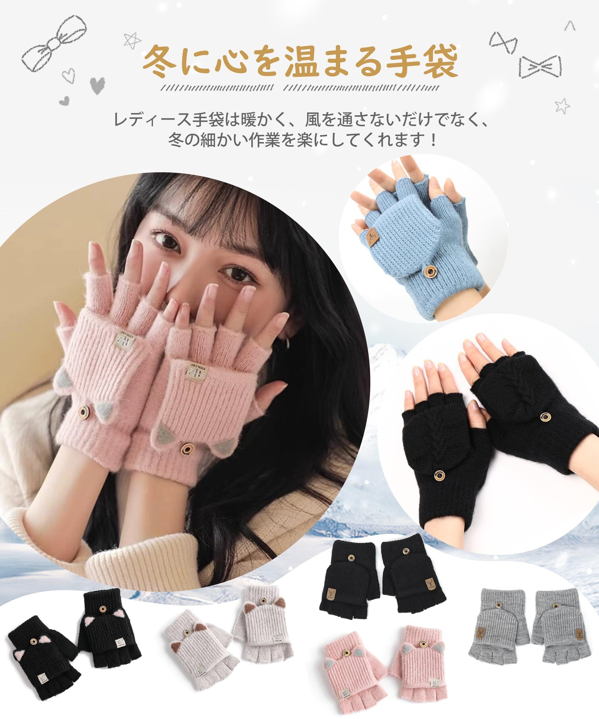 [MOWO] 手袋 レディース 指なし手袋 【ふわふわ柔い・保温効果に 寒風ガード袖口】 冬 指出し レディース手袋 ミトン ニット製 フード手袋 半指手袋 厚手 暖かい かわいい スマホ対応 防寒防風 2WAY プレゼント 自転車 通勤・通学 旅行