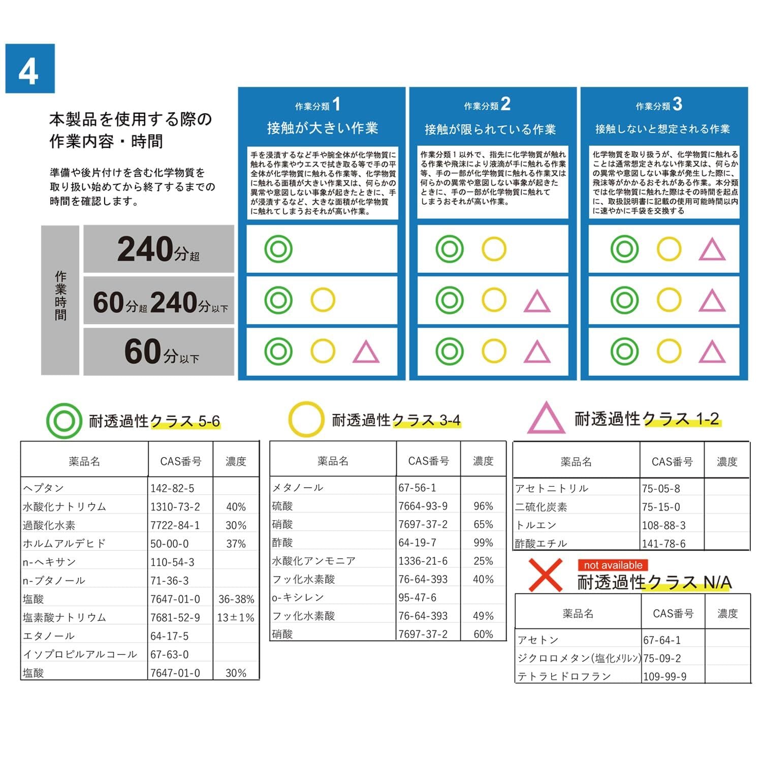 【主な用途】薬品工場での各種化学物質の取扱い、自動車工場での脱脂・溶剤作業、塗装業・建築現場での薬剤処理、農業・農薬・殺虫剤の散布作業、金属加工・インク・接着剤の扱いがある工場環境 【素材】表=ニトリルゴム(NBR)、裏=綿(吹付け加工) 【表面加工】逆ひし形グリップ加工 【カラー】グリーン 【サイズ展開】S / M / L / LL 【EN規格】EN374規格:EN ISO 374-1:2016 TYPE A(AJKLOT),EN ISO 374-5:2016、EN388規格:4101X 【入数】1双