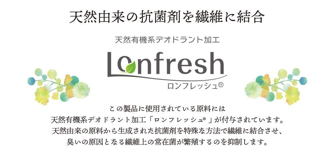 ●この製品に使用されている原料とは天然有機性デオトラント加工「ロングフレッシュ」が付与されています。天然由来の原料から生成された抗菌剤を特殊な方法で繊維に結合させ、臭いの原因となる繊維状の常在菌が繁殖するのを抑制します。