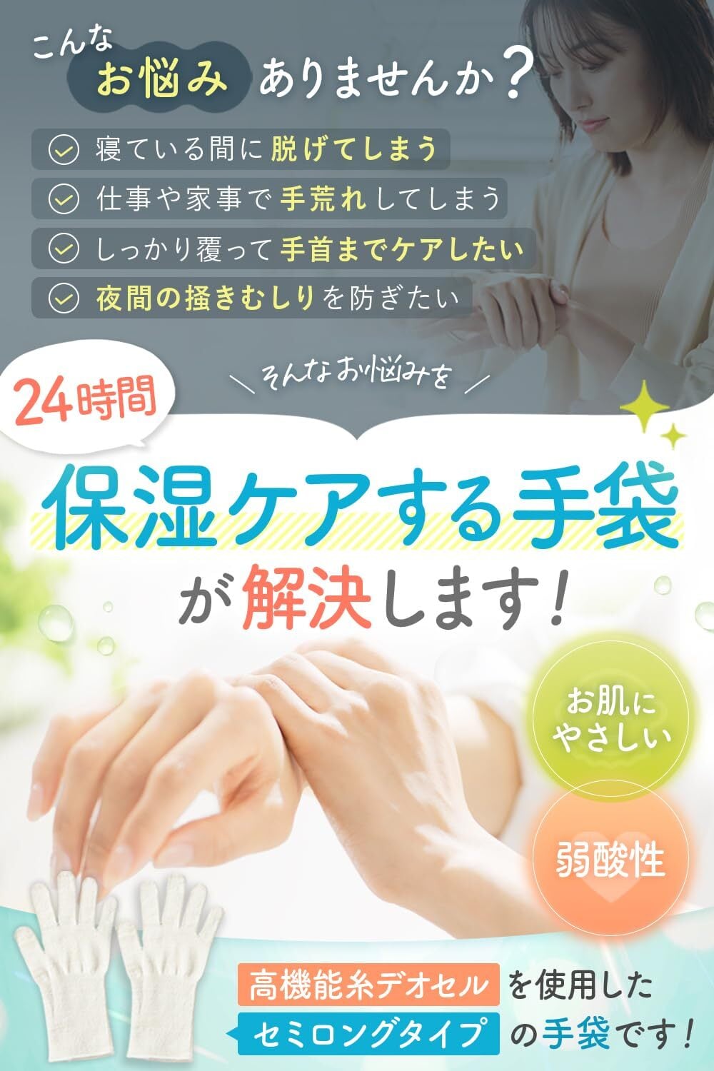 関連キーワード:[ハンドケア, 日本製, 保湿手袋, ナイト手袋, 皮膚科医監修, 弱酸性ヴェール, おやすみ手袋]