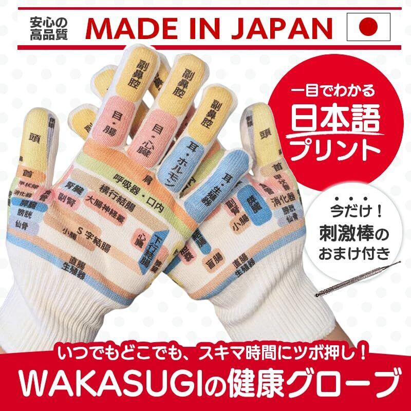 敬老の日 手ツボグローブ 日本製WAKASUGIの健康グローブ 毒出し棒付き つぼ手袋 手のひらにツボの絵が描いてある手袋 男女兼用 フリーサイズ 1日3分 お試しください スッキリ感覚