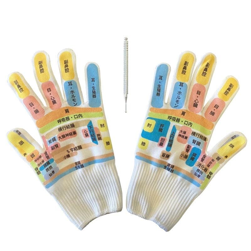 手のひらのツボ押しは、お茶の間やオフイス、電車の中や待合室など、いつでもどこでもできるのが魅力です。 よりお楽しみにいただくには、次のことをお試しください。 〇手袋を装着する前に、両手をこすり合わせるなどして温めておきましょう。 〇1回、3分を基準に、ひとつのツボに対して1分程度が目安にしてください。 〇はじめのうちは3日続けて5日休むのがおすすめ。慣れていくにしたがい、5日続けて10日休むなど少しづづ休む期間を長くしていきます。 〇椅子に座るなどラクな姿勢でお願いいたします。 〇力を加えていく順番は指先から手首へと向かって刺激します。 〇ツボ押しを終えたら、仕上げに手首を50回ぐらいぶらぶらと振りましょう。 〇つぼ刺激後、コップ2~3杯の白湯を飲むとより良いです。 ツボが描いてある手袋 今だけ健康スティク付き