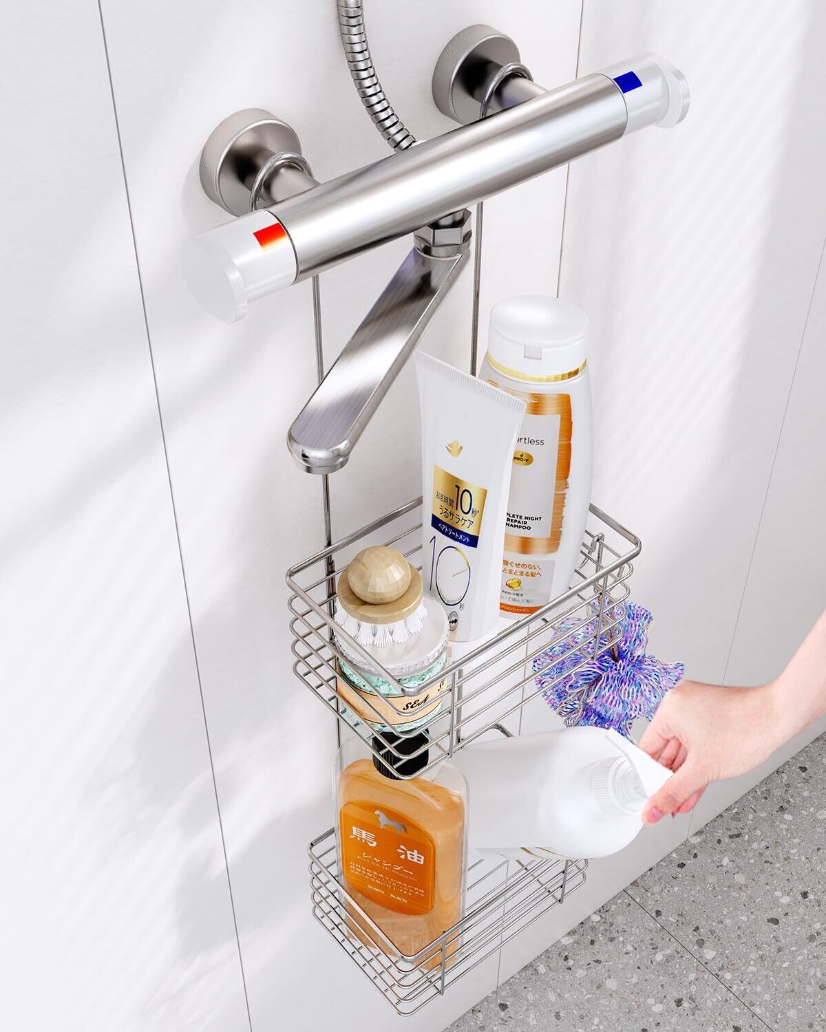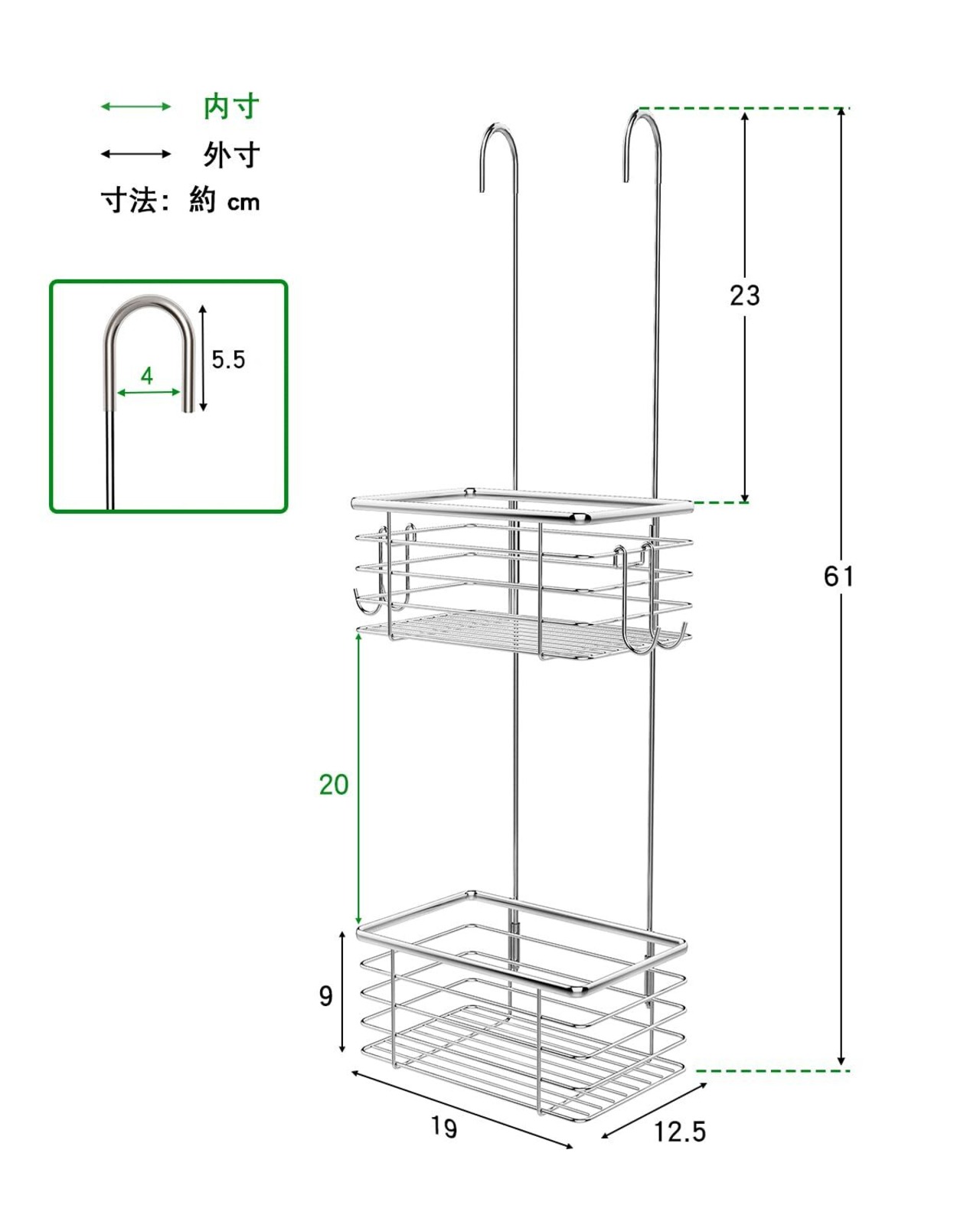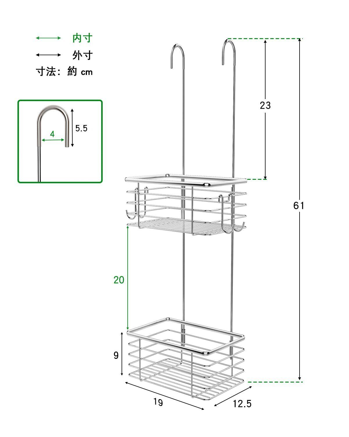大きさ: 高さ61cm x 幅19cm x 奥行12.5cmのコンパクトサイズで、浴室の限られたスペースを効率的に活用,2 つのフックを同梱してお届けします。さらに多くの物品を収納できます。