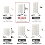 幅34cm、奥行42cm、高さ87.5cmというスリムなサイズにもかかわらず、4段の引き出しを備えており、豊富な収納力を提供します。衣類はもちろん、洗面所の小物やリビングの雑貨など、さまざまなアイテムを簡単に整理できます。