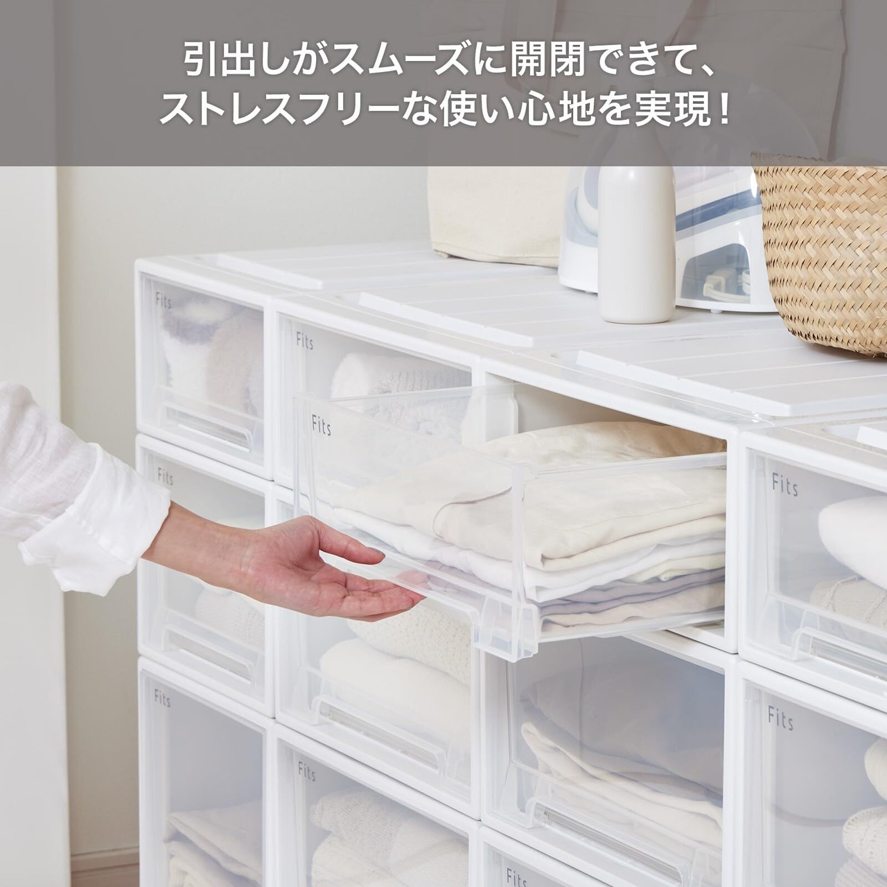 ホワイトクリアのシンプルなデザインは、リビングや子供部屋、クローゼットなど、どんな場所にも馴染みます。衣類の他にも、文房具やおもちゃ、季節の装飾品など、幅広い収納シーンで活躍します。