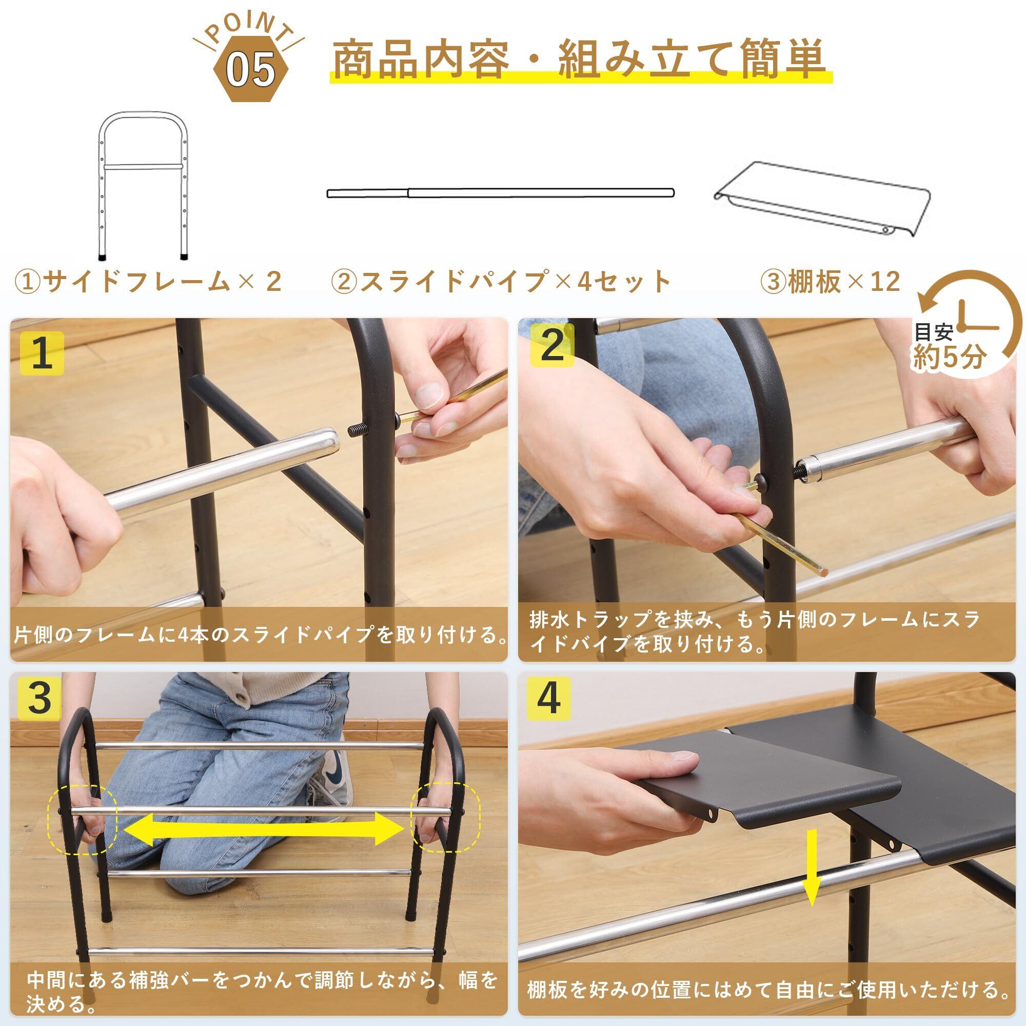 【大容量で大きなシンク下にも対応】元の基礎の上で棚板の数を10枚から12枚に増やし、より大きな収納スペースを持つことができます!横幅はスペースに合わせて自在に49cm~88cm無段階伸縮可能、シンク下が狭いご家庭でも使いやすい。棚板は1.5cmピッチで6段階高さ調節可能、限られた空間を2段のラックで分けることで、大きなシンク下の空間を効率よく利用できます。