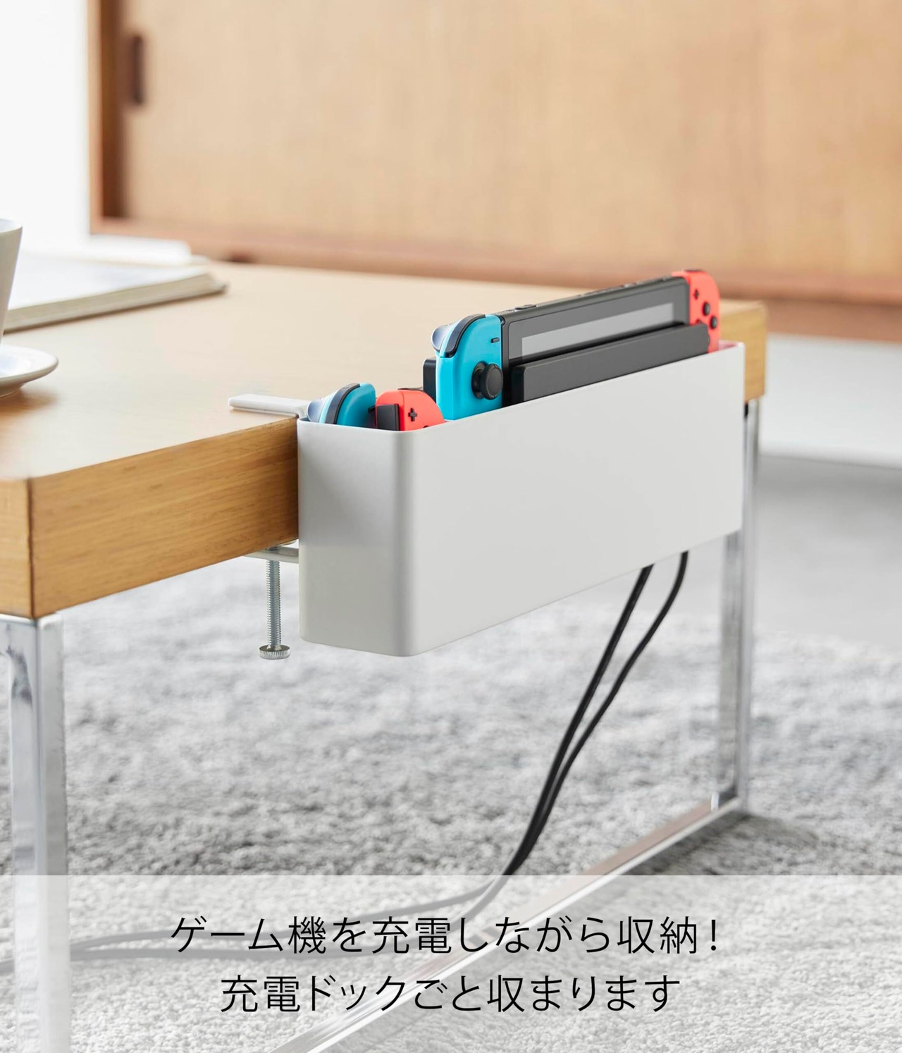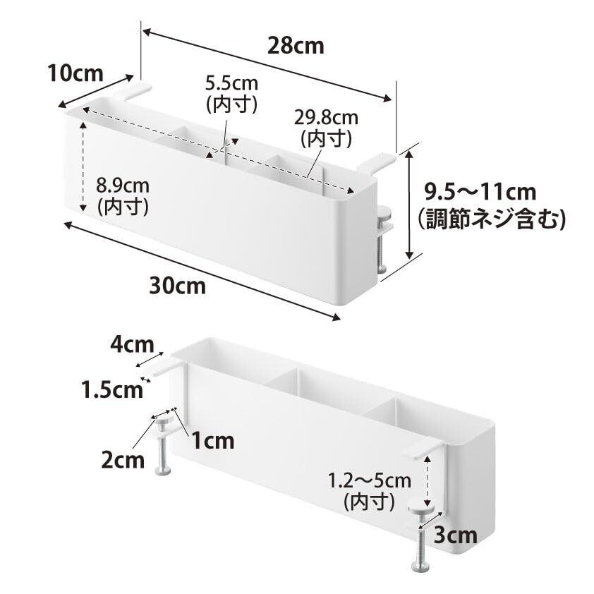 対応サイズ:天板の厚さが1.2~5cm(幕板やパイプなど含む) 幅28cm以上(脚含まず) 奥行き4cm以上のデスク・テーブル・キッチンカウンターなど ※設置する部分の構造によっては取り付けできない場合があります。 差し込む端子がW2.5×D1.2cm以内の充電ケーブル ※収納する物の充電の仕様によっては、ご使用いただけません。